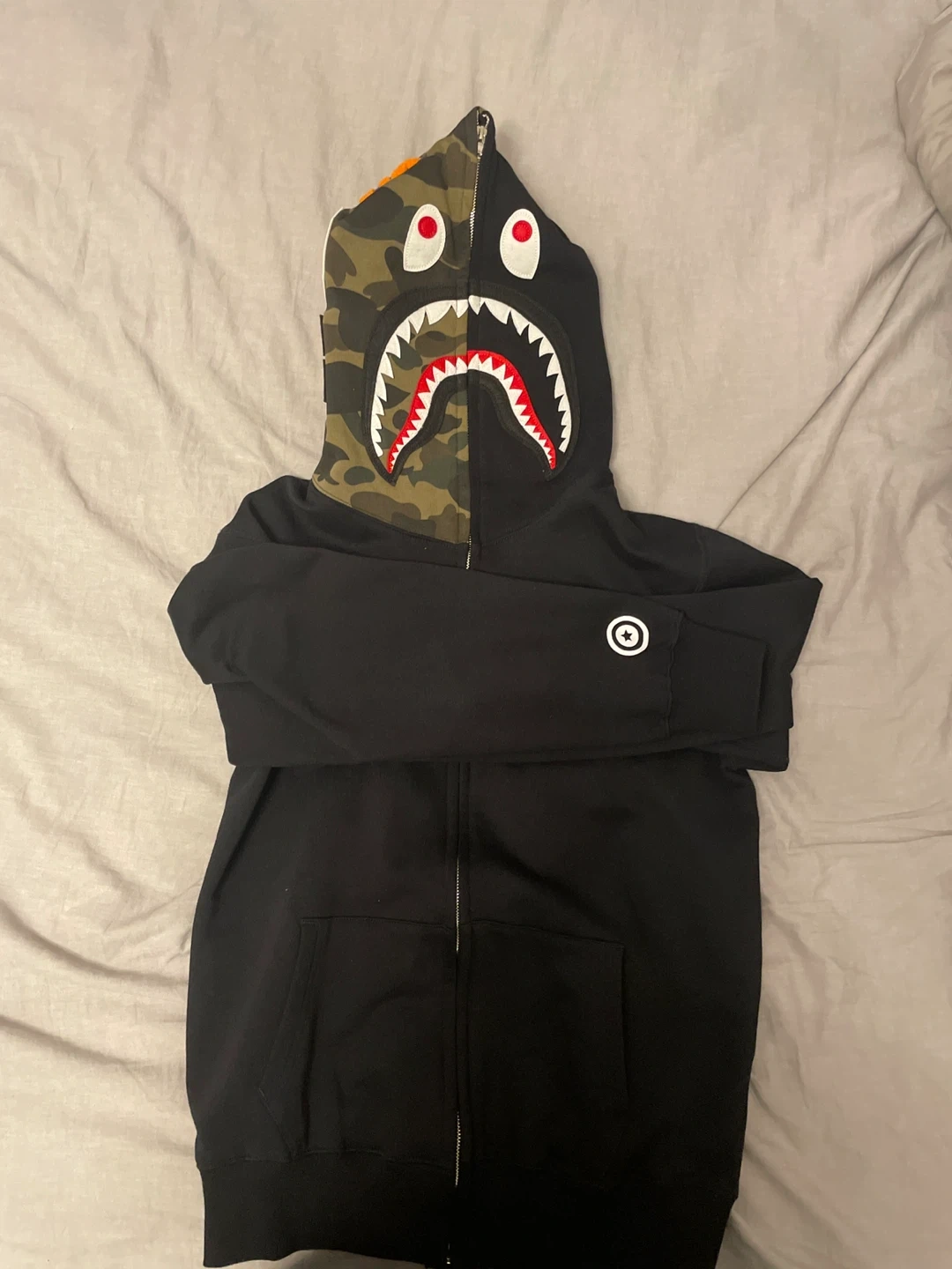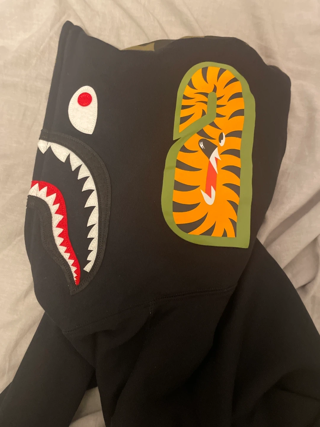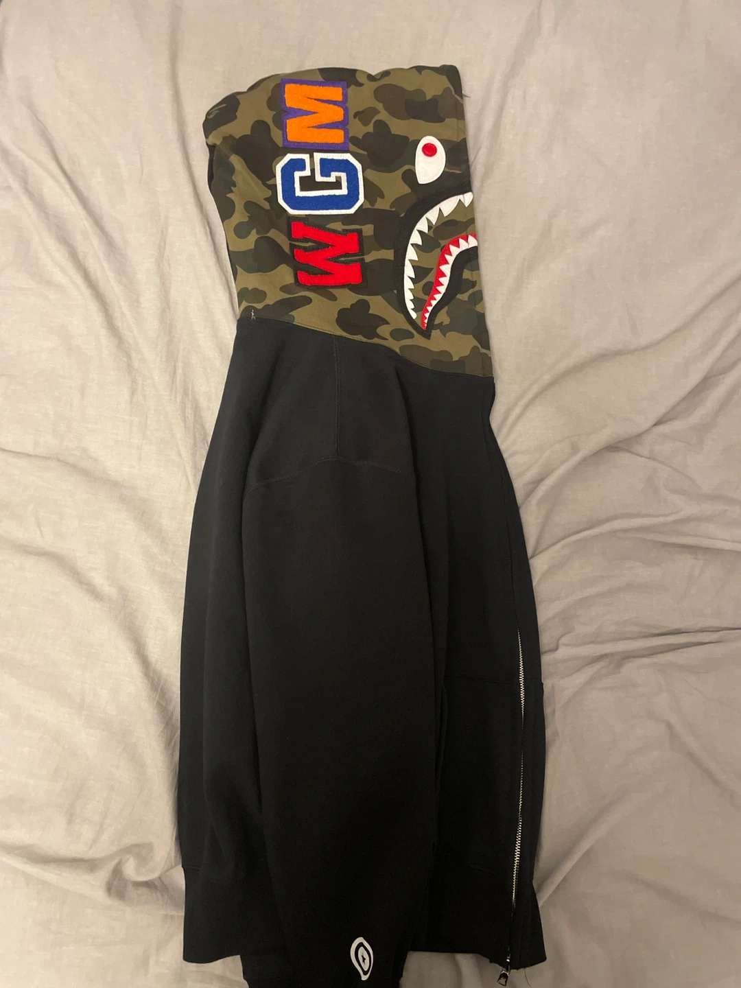 This is an A TRIED ON Bathing Ape full zip hoodie. It features the iconic shark design on the hood and has a size M tag.