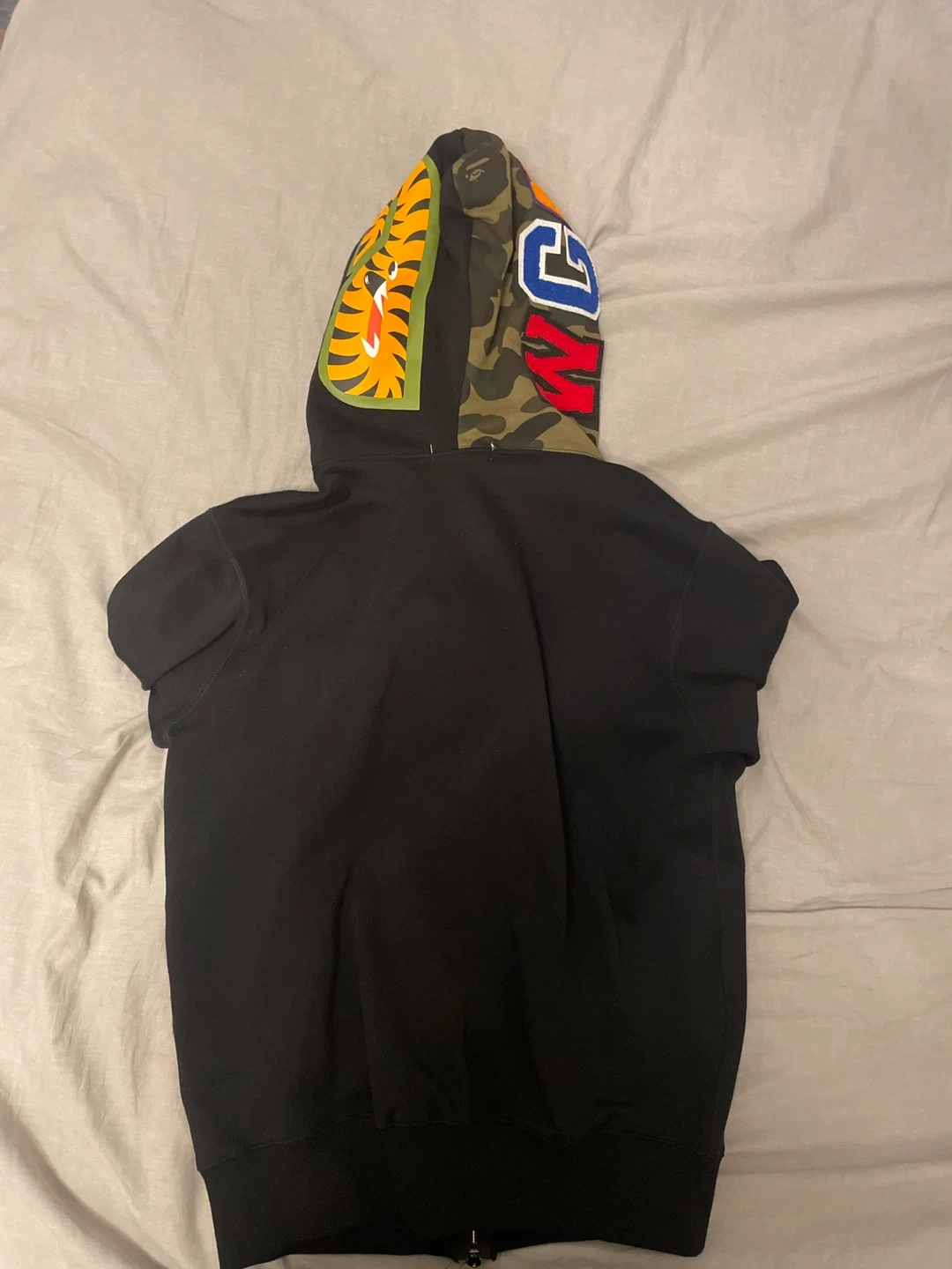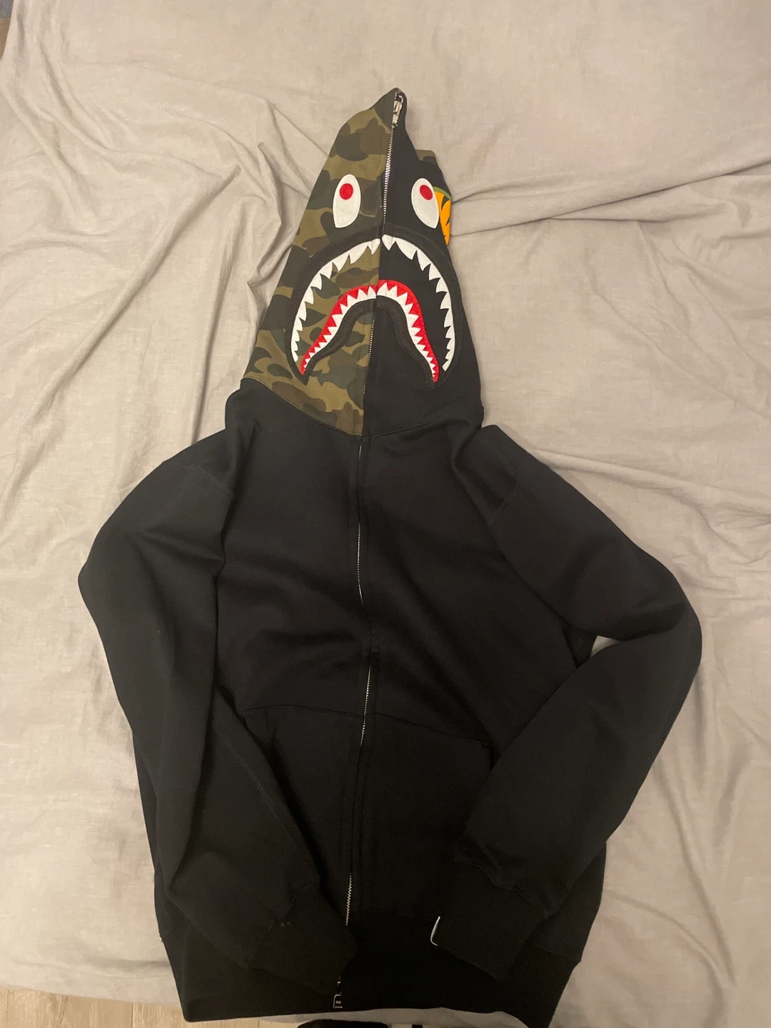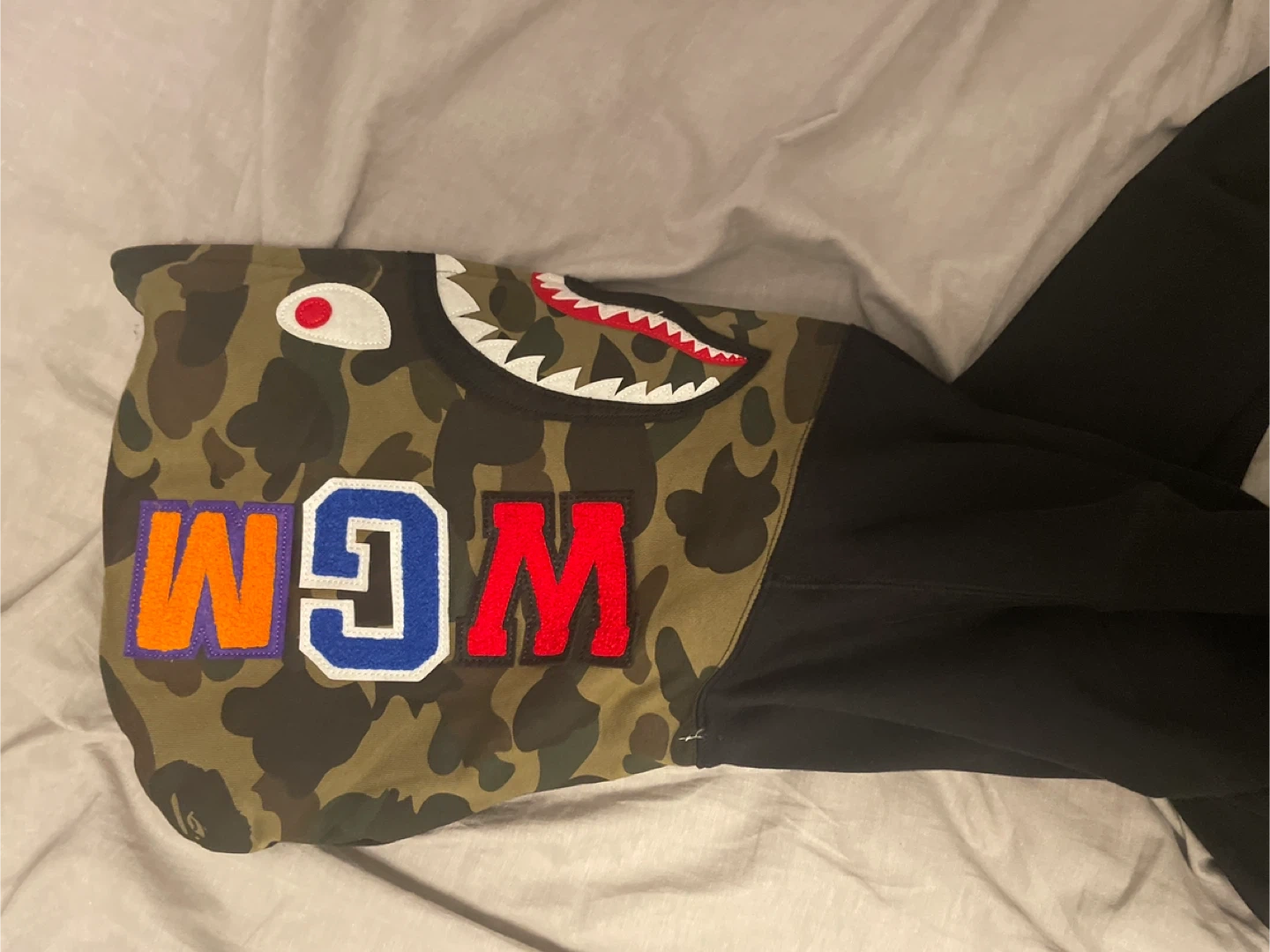 This is an A TRIED ON Bathing Ape full zip hoodie. It features the iconic shark design on the hood and has a size M tag.