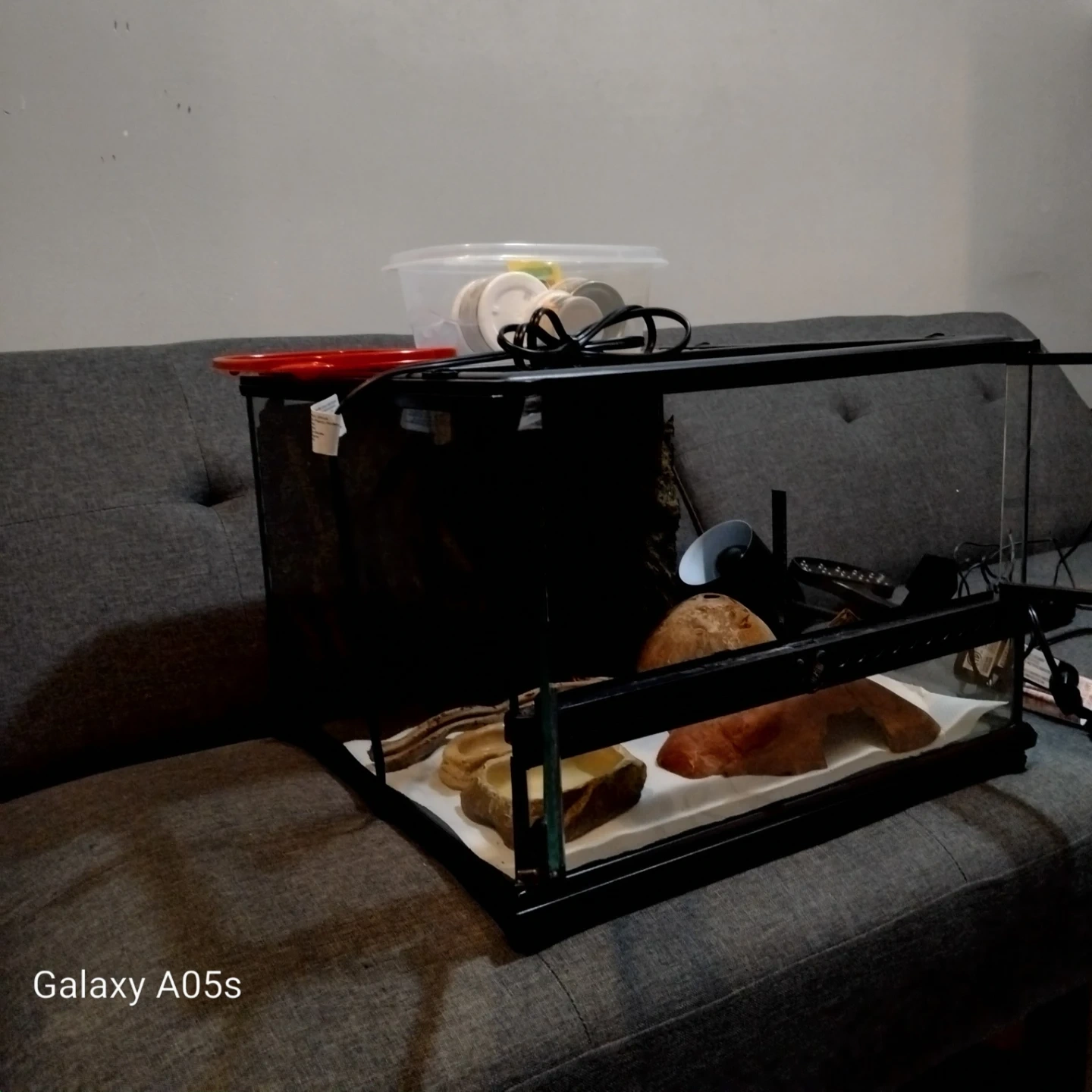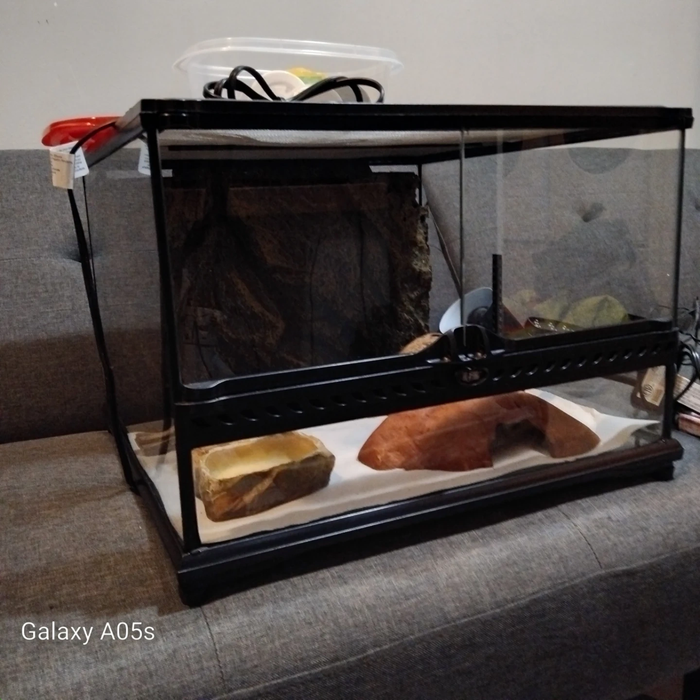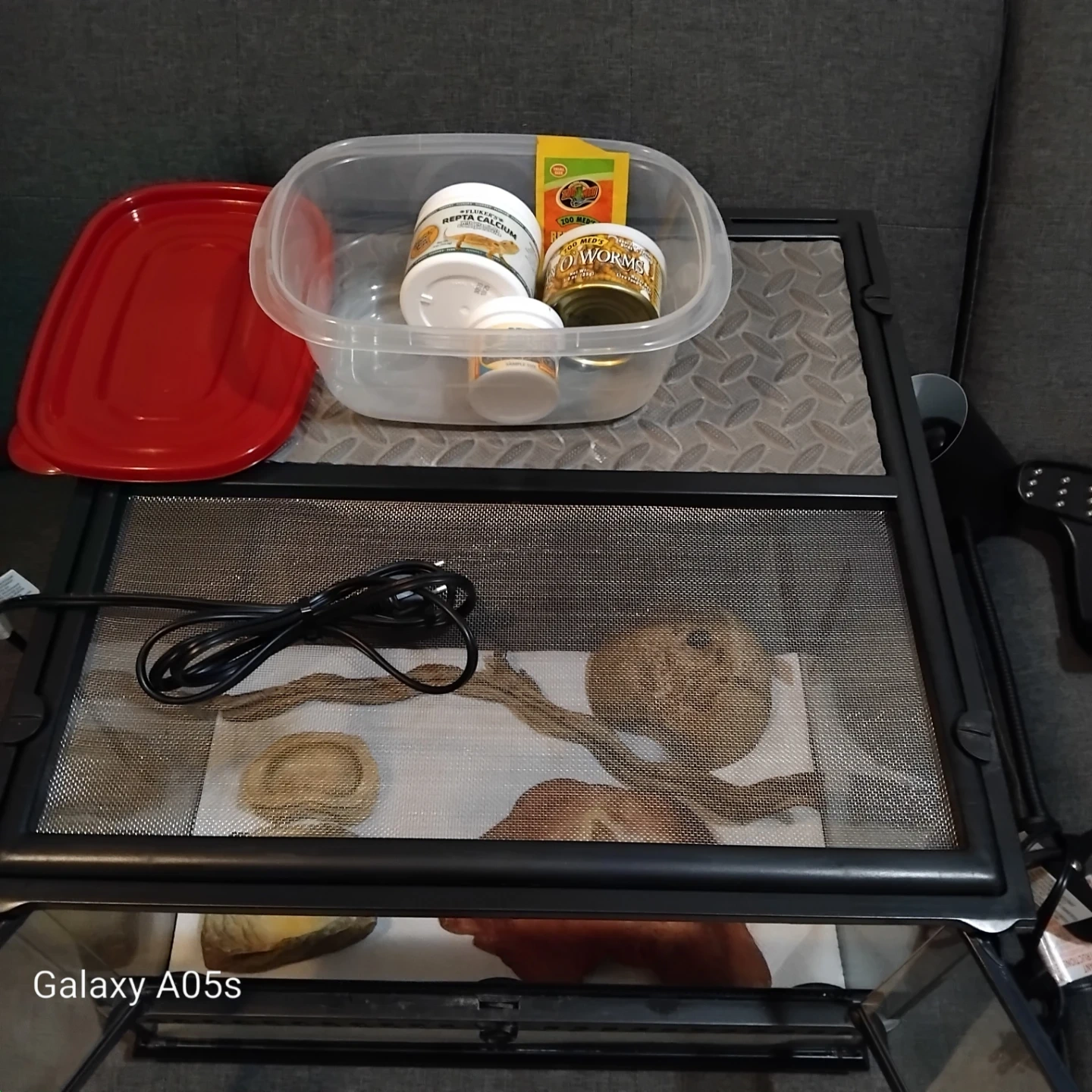 Glass terrarium suitable for reptiles or other small pets. Includes a heat lamp, food dishes, and supplements like Fluker's Repta Calcium and Zoo Med's ReptiVite. Also comes with a container for food storage.