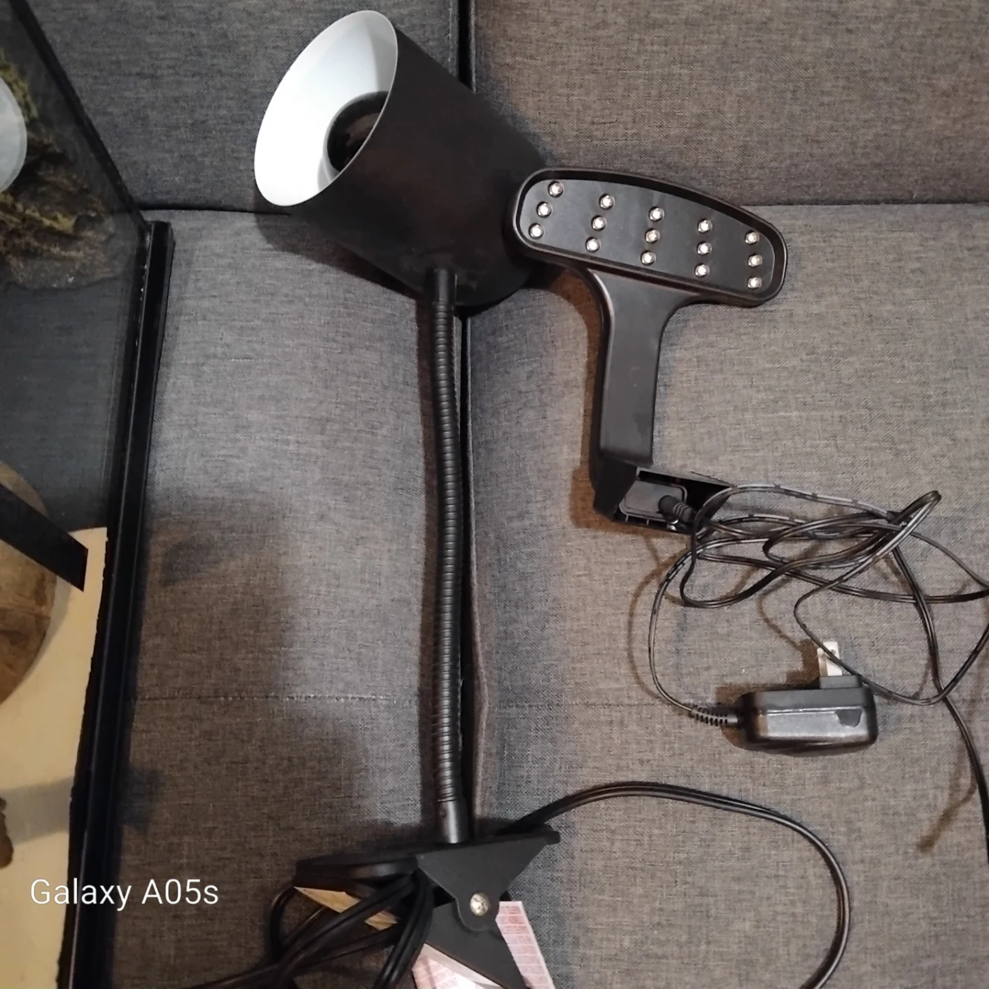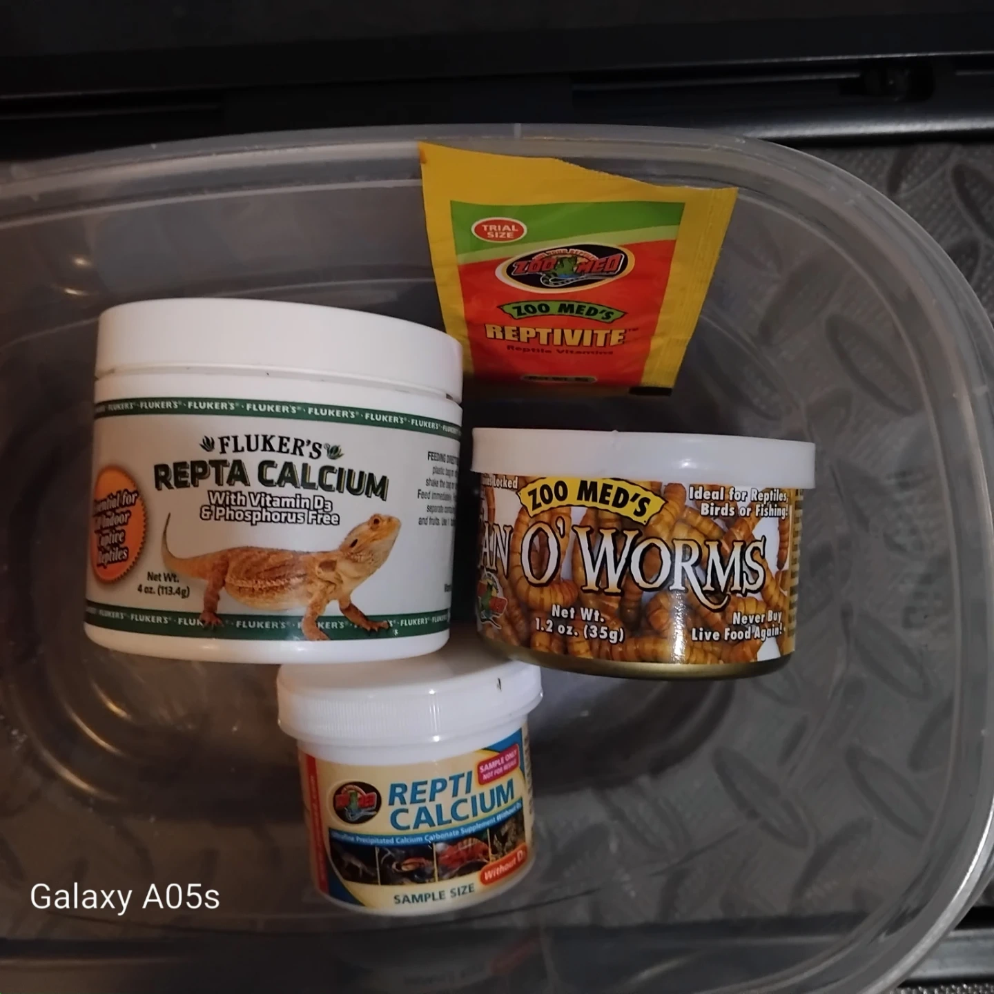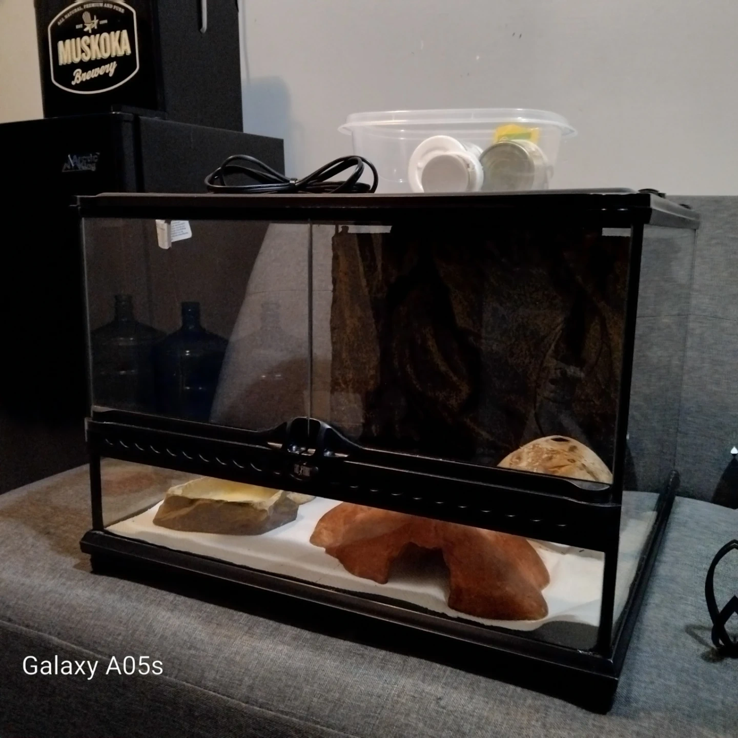 Glass terrarium suitable for reptiles or other small pets. Includes a heat lamp, food dishes, and supplements like Fluker's Repta Calcium and Zoo Med's ReptiVite. Also comes with a container for food storage.