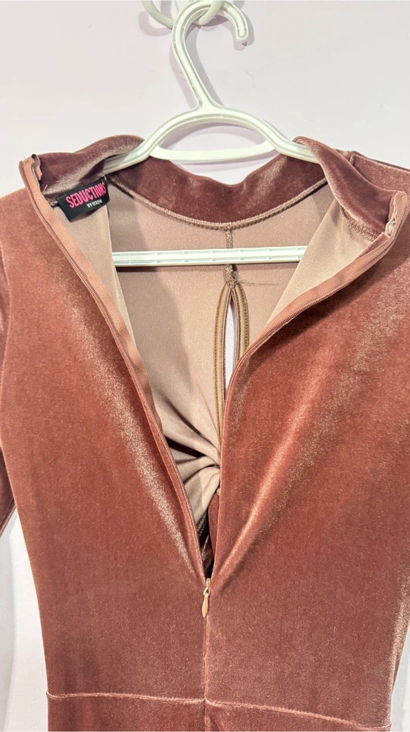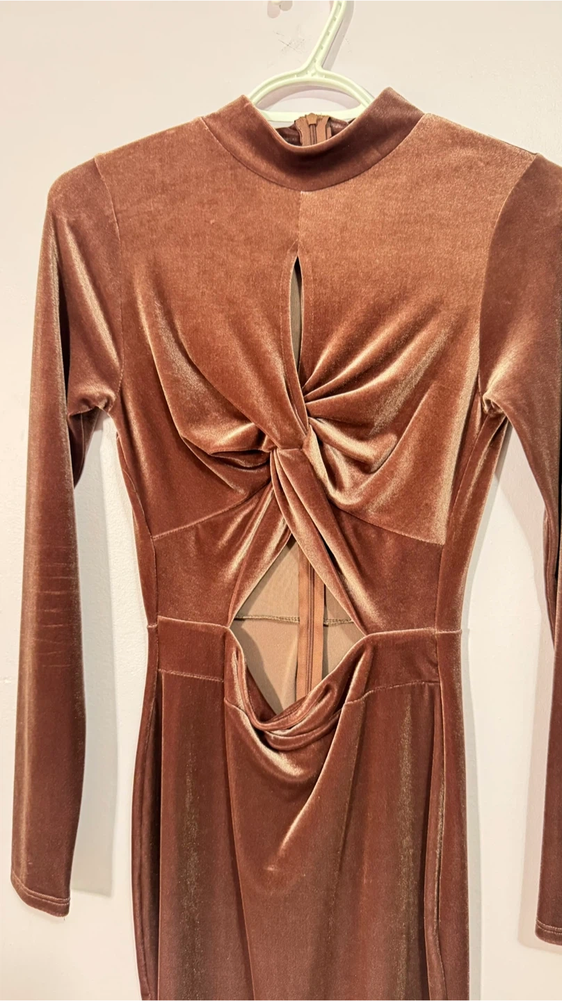 This long-sleeved velvet dress features a stylish twist front and cut-out detail. It's made of a stretchy velvet material and has a back zipper closure. Dress it up for a night out!