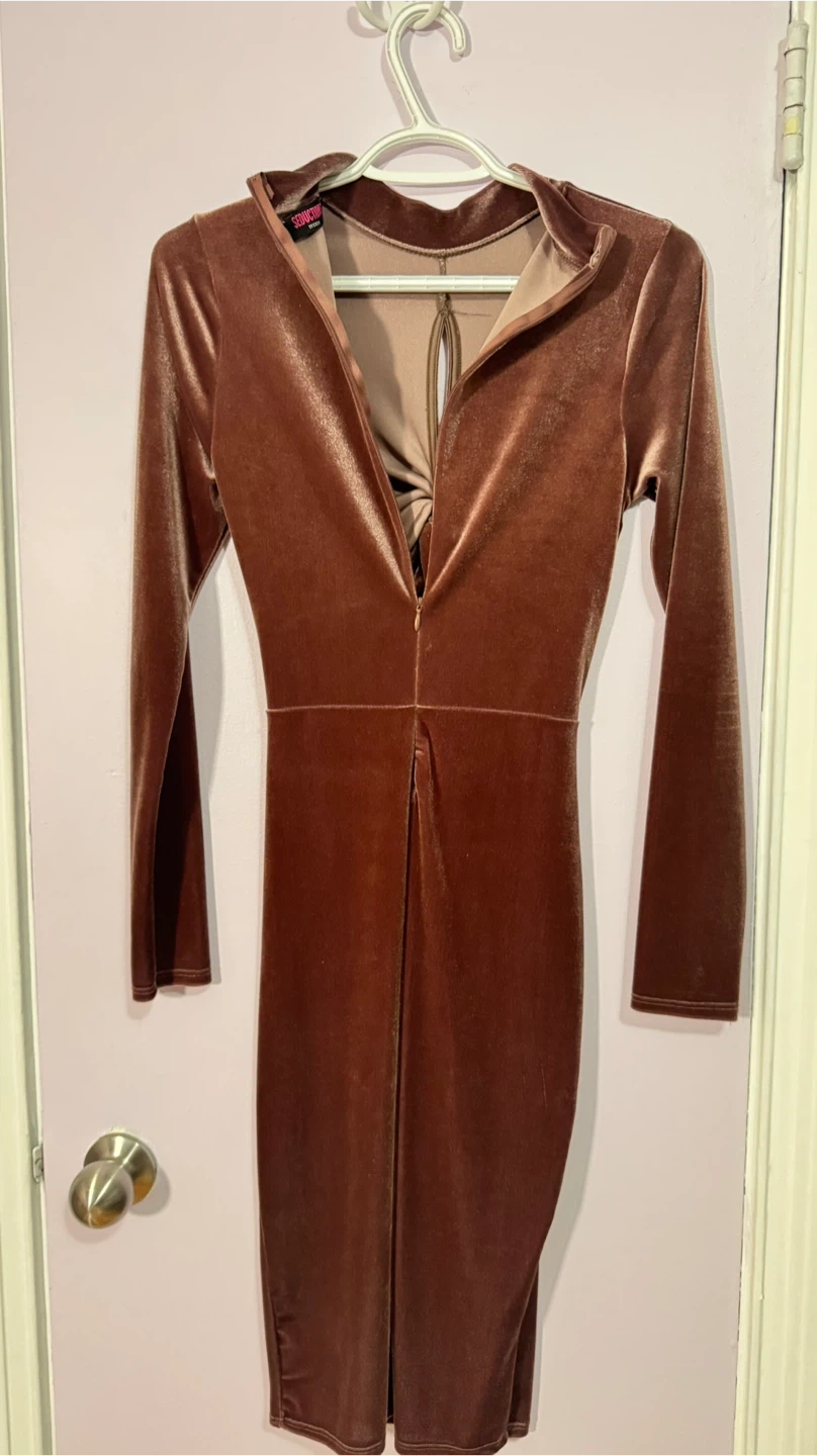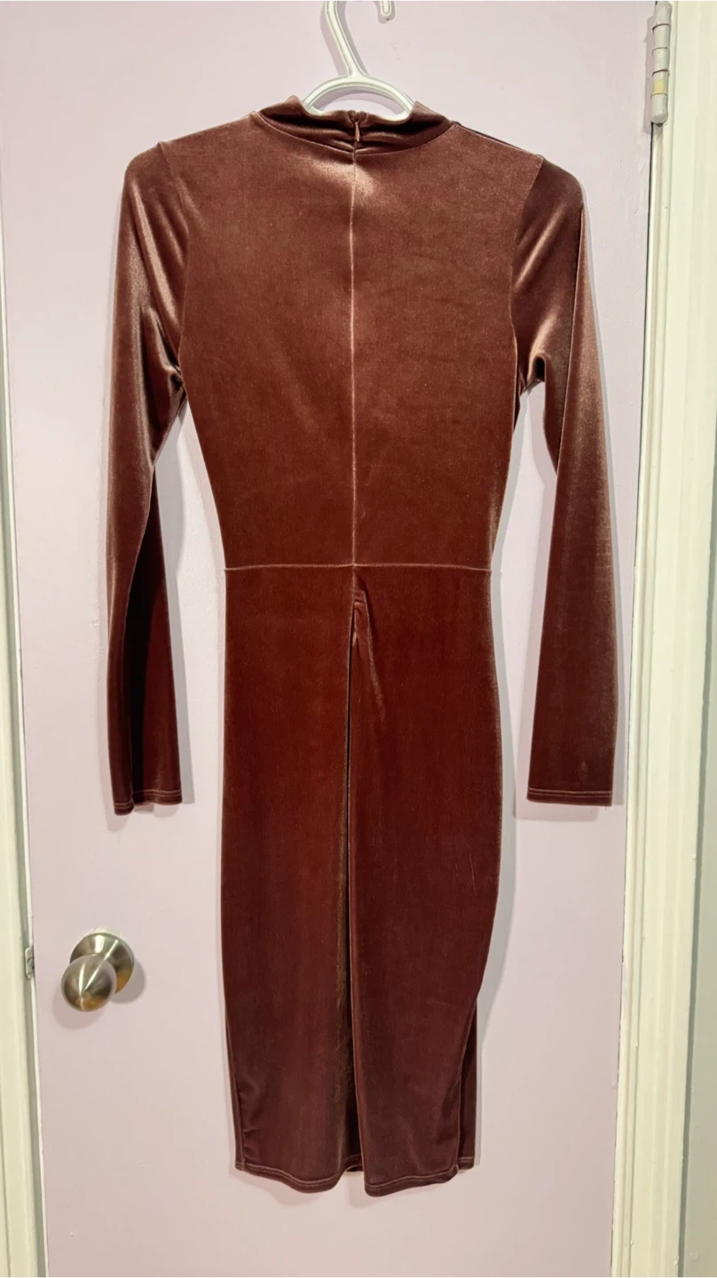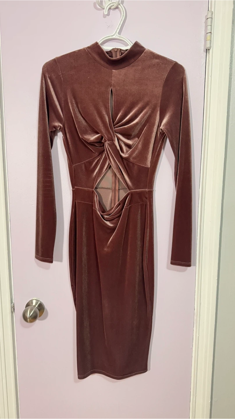 This long-sleeved velvet dress features a stylish twist front and cut-out detail. It's made of a stretchy velvet material and has a back zipper closure. Dress it up for a night out!
