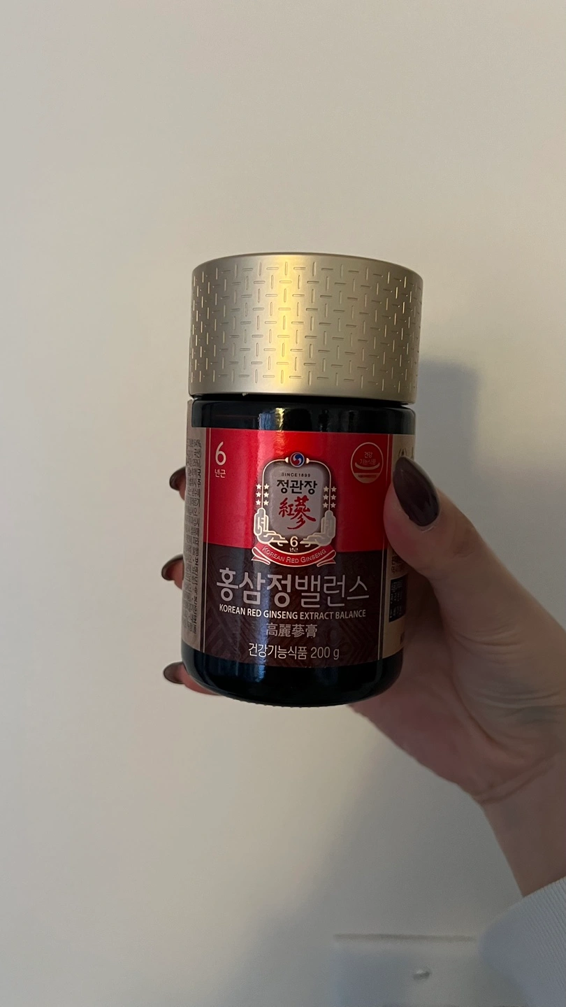 200g jar of Korean red ginseng extract. Supplement for balance. Gold and red packaging.