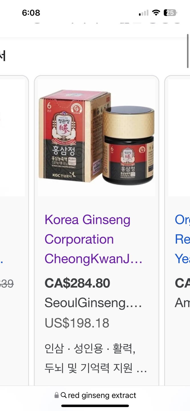 200g jar of Korean red ginseng extract. Supplement for balance. Gold and red packaging.