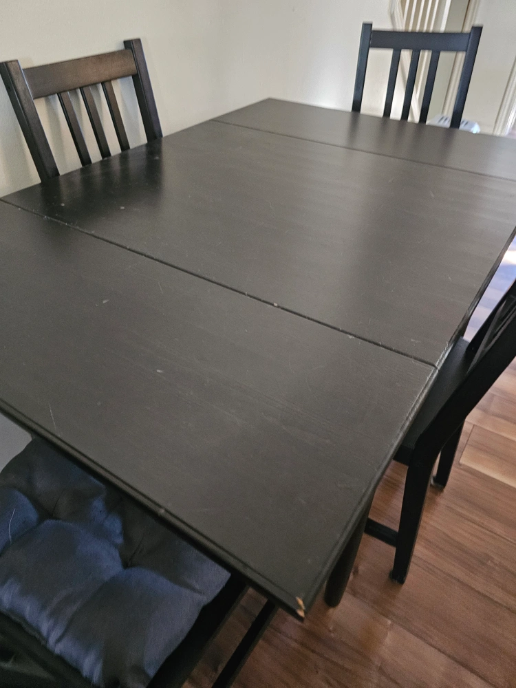 Selling a black dining table that comes with four chairs. The table has folding sides that can be used to extend it or tick away, also with lined drawer. It's perfect for a small space or a cozy dining area. We have 2 semi matching extra chairs making that makes 6! 29.5' for height of table. 18' seat height (where you sit) back included is 35'. Cat not included