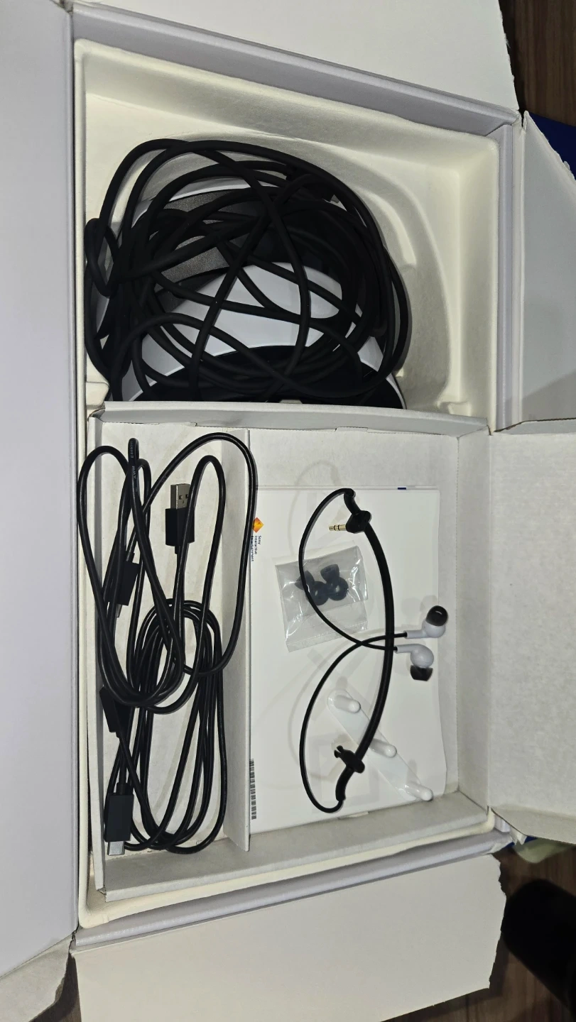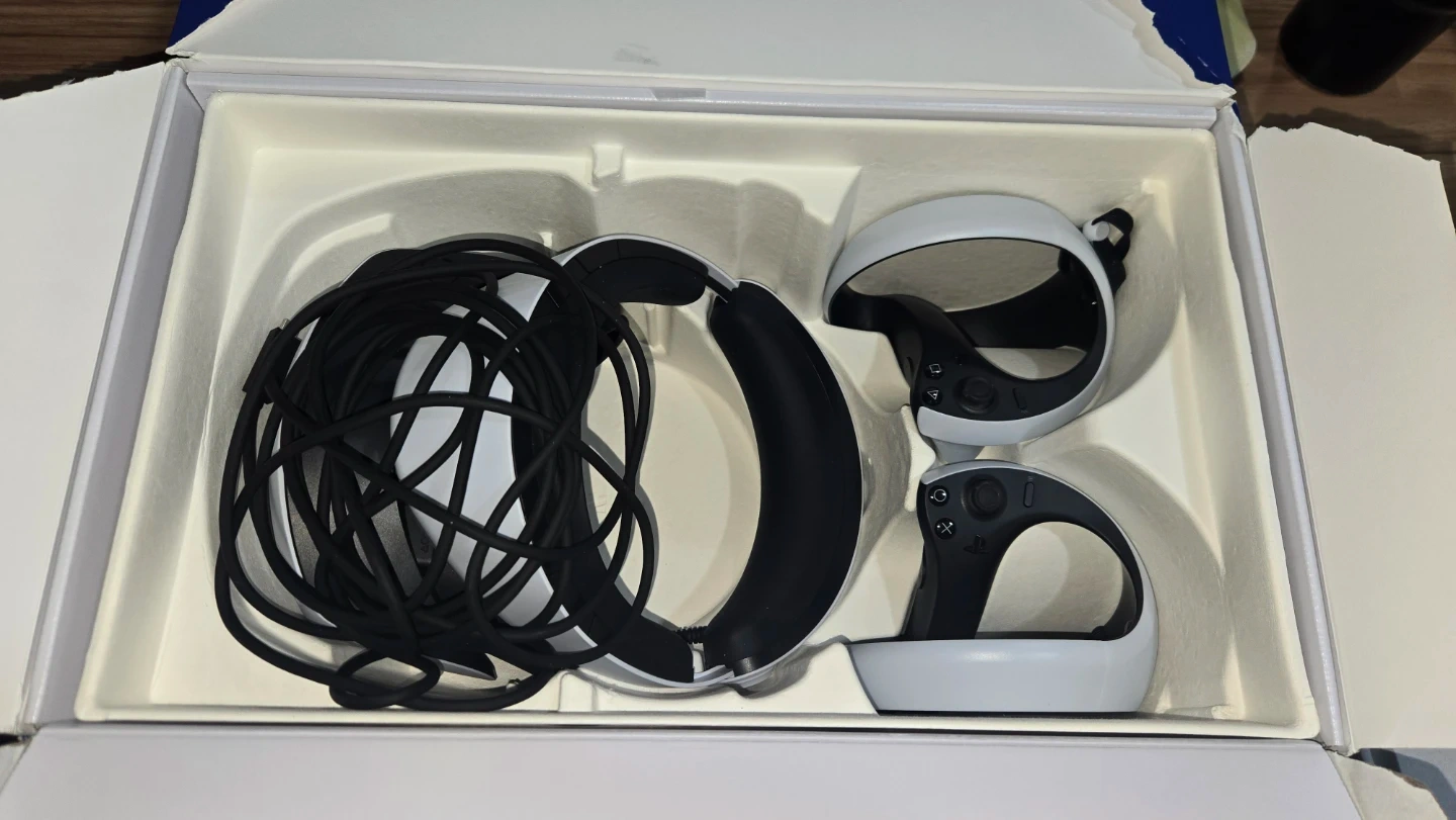 This is the Sony PlayStation VR2 headset and controllers for the Horizon Call of the Mountain bundle. It includes the headset, two Sense controllers, and necessary cables. The original packaging is present.