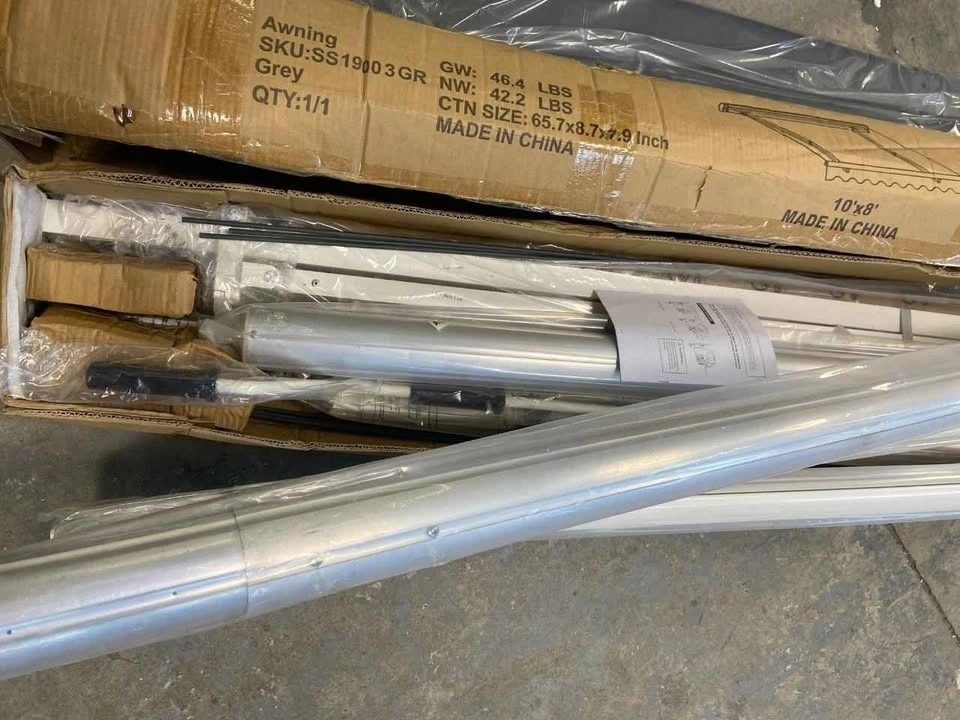 This deck awning features a solid aluminum and metal frame with a powder-coated finish for stability and longevity. The tilt angle is adjustable from 45-85 degrees, and the height can also be adjusted for optimal shade. The 280g polyester fabric with PU coating is tough and UV resistant, designed for sun protection and light rain. It's great for placement above windows or doors. Color: Grey.