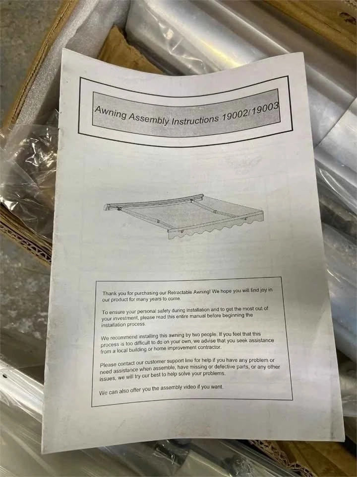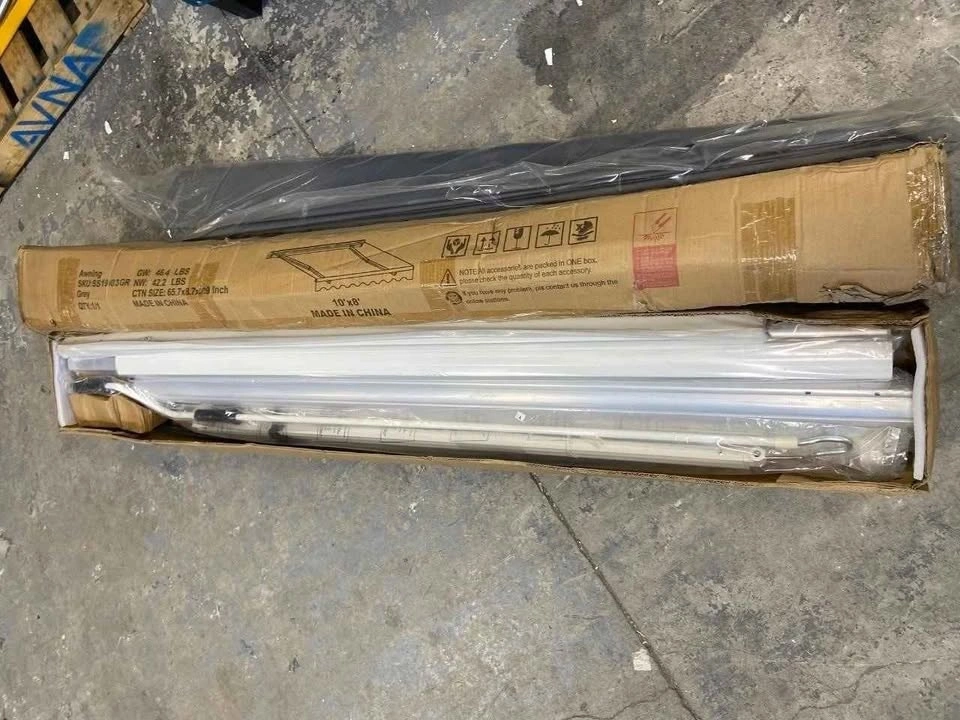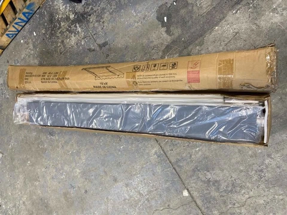 This deck awning features a solid aluminum and metal frame with a powder-coated finish for stability and longevity. The tilt angle is adjustable from 45-85 degrees, and the height can also be adjusted for optimal shade. The 280g polyester fabric with PU coating is tough and UV resistant, designed for sun protection and light rain. It's great for placement above windows or doors. Color: Grey.