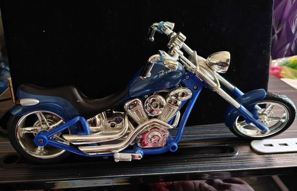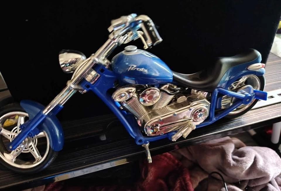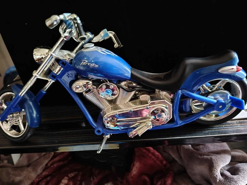 Collectible blue Bratz doll motorcycle chopper, originally released as part of the MGA Entertainment Motorcycle Style line around 2003. Model Type: Chopper-style motorbike designed for Bratz or Bratz Boyz dolls. Located in Crowsnest Pass.