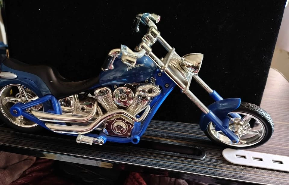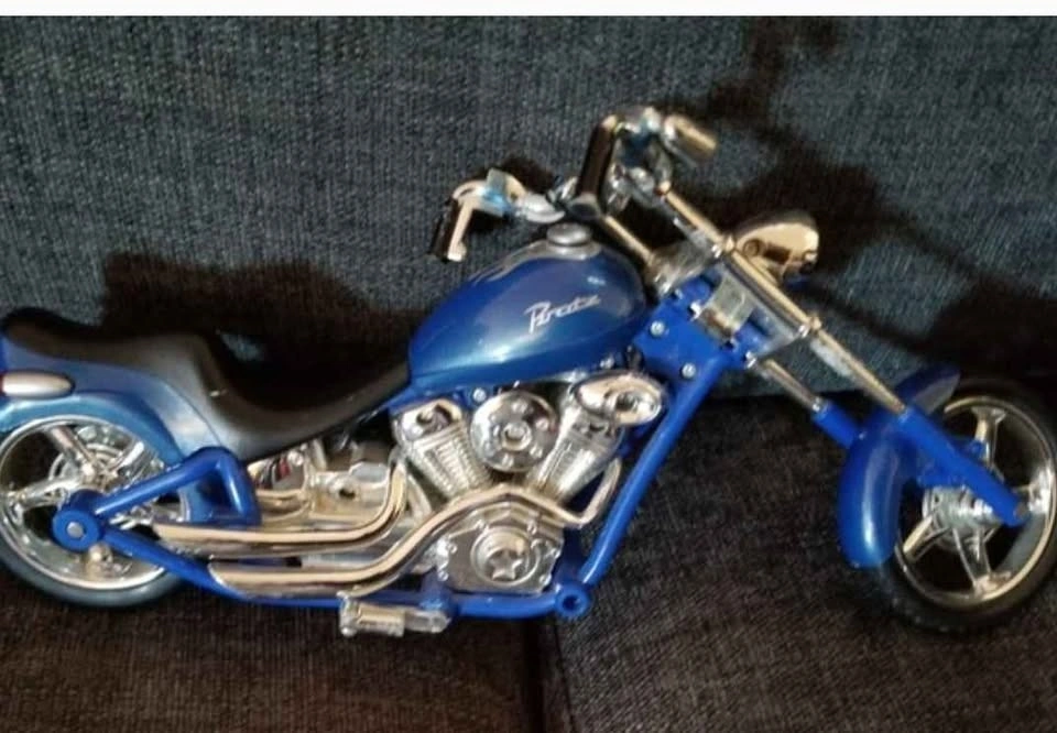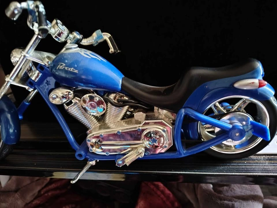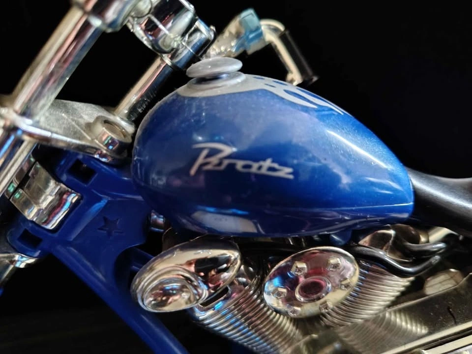 Collectible blue Bratz doll motorcycle chopper, originally released as part of the MGA Entertainment Motorcycle Style line around 2003. Model Type: Chopper-style motorbike designed for Bratz or Bratz Boyz dolls. Located in Crowsnest Pass.