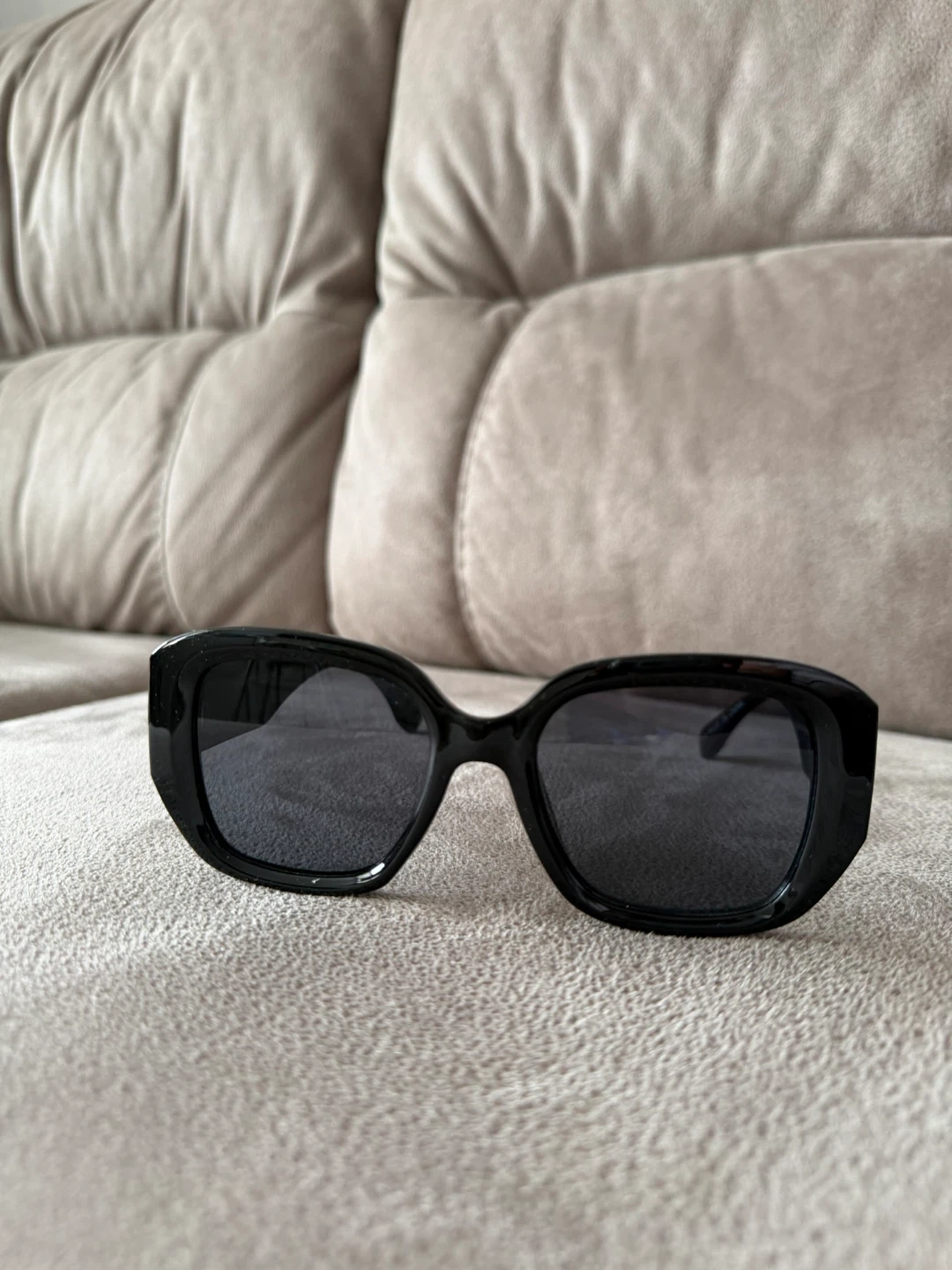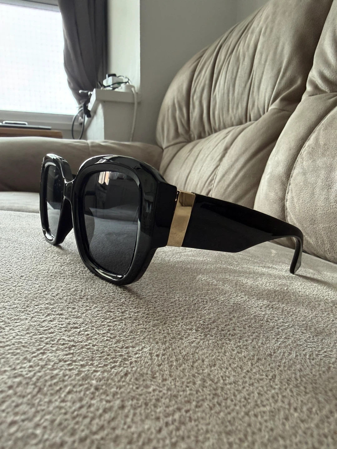 Stylish black oversized square sunglasses. They feature a chic gold accent on the temples. These sunglasses offer a bold look for sunny days.