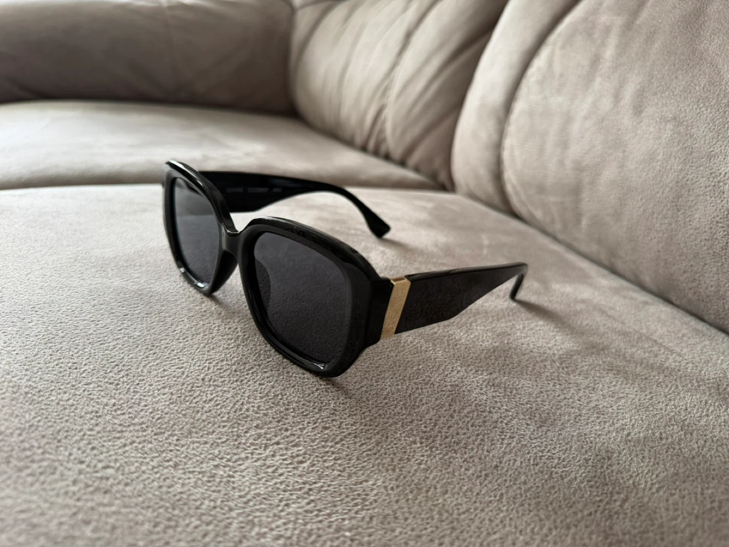 Stylish black oversized square sunglasses. They feature a chic gold accent on the temples. These sunglasses offer a bold look for sunny days.