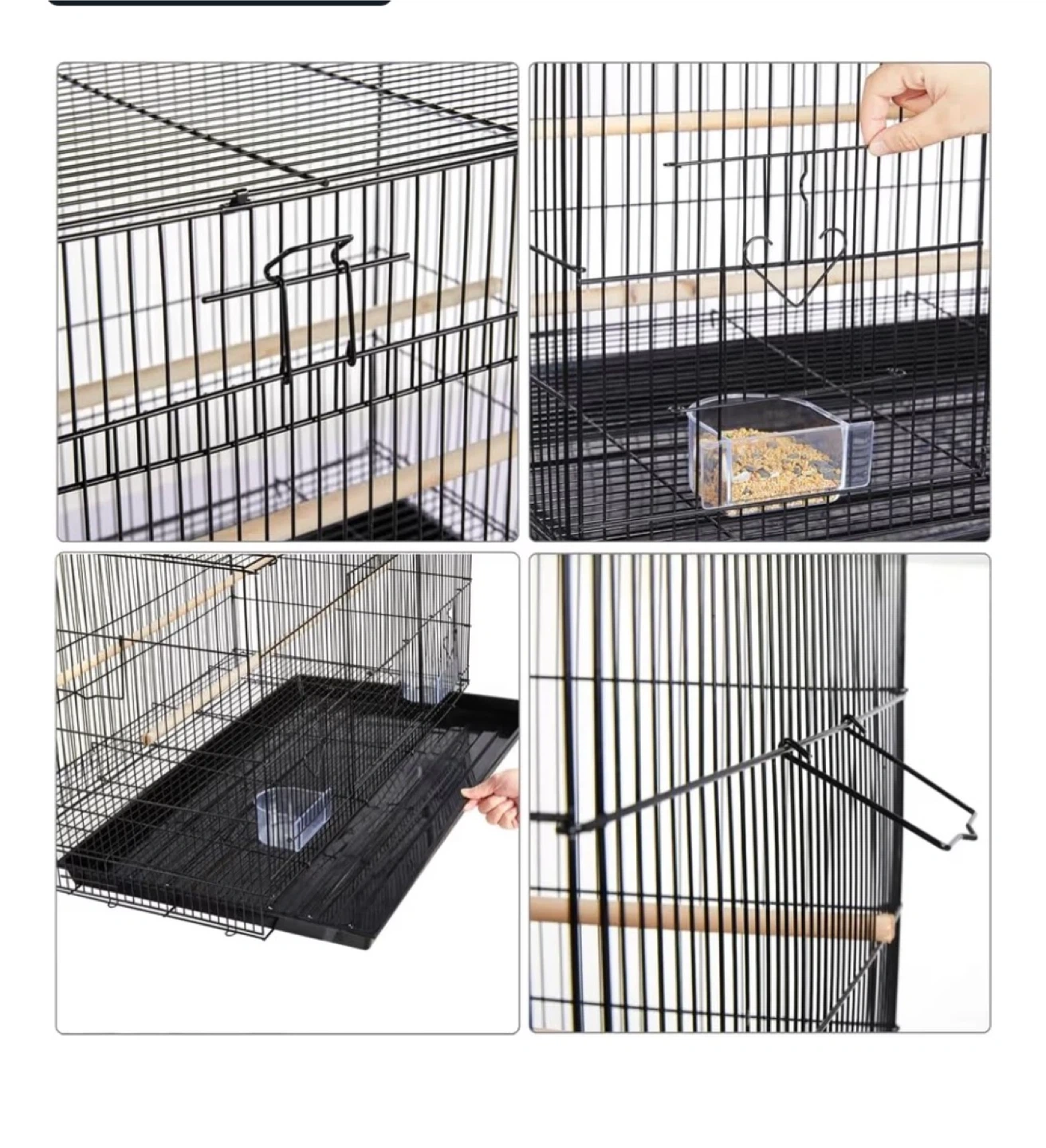 Wire bird cage with two perches and two food/water cups. Includes a pull-out tray for easy cleaning. Dimensions are 30.5" L x 18.5" W x 18" H.