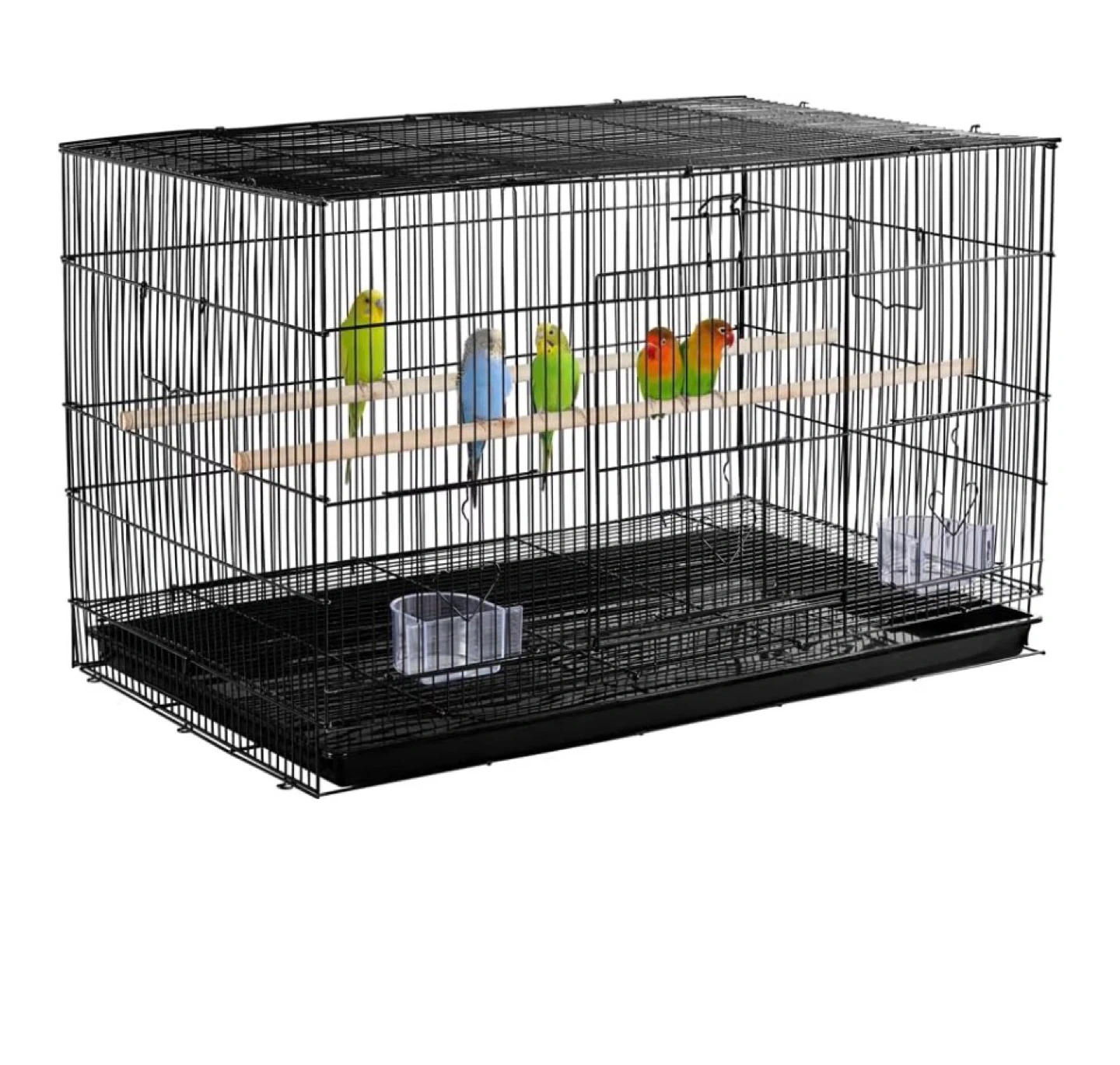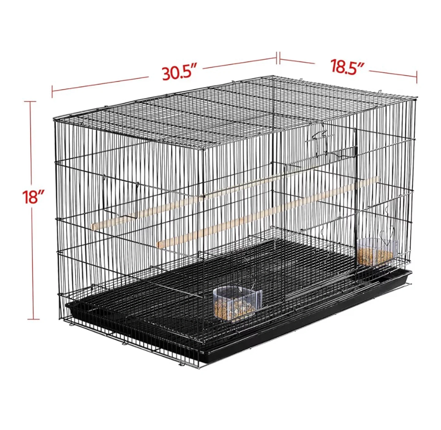 Wire bird cage with two perches and two food/water cups. Includes a pull-out tray for easy cleaning. Dimensions are 30.5" L x 18.5" W x 18" H.