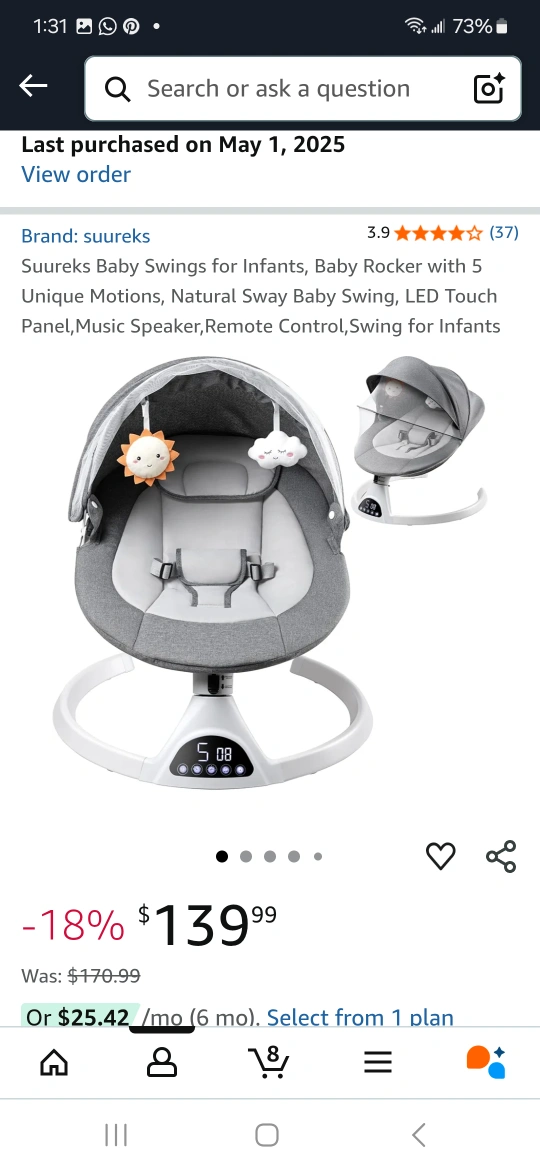 Selling a gently used baby swing in grey. It's in great condition and ready for a new home. Perfect for soothing your little one, 5 unique motions,LED touch panel,Music speaker, remote control, Bluetooth,also has a net so it can be used outdoors. No stains,we hardly used because it was purchased when my daughter was 3 months old. Retails for $158.19 on Amazon. Purchased May 1st 2025.