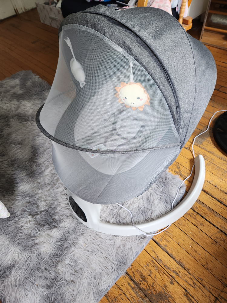 Selling a gently used baby swing in grey. It's in great condition and ready for a new home. Perfect for soothing your little one, 5 unique motions,LED touch panel,Music speaker, remote control, Bluetooth,also has a net so it can be used outdoors. No stains,we hardly used because it was purchased when my daughter was 3 months old. Retails for $158.19 on Amazon. Purchased May 1st 2025.