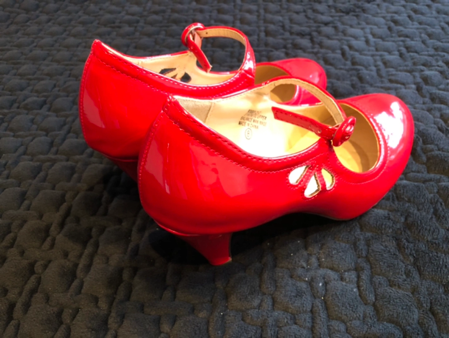 Women's red patent Mary Jane shoes. Size 8. Low heel. Synthetic upper.