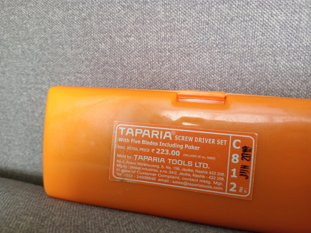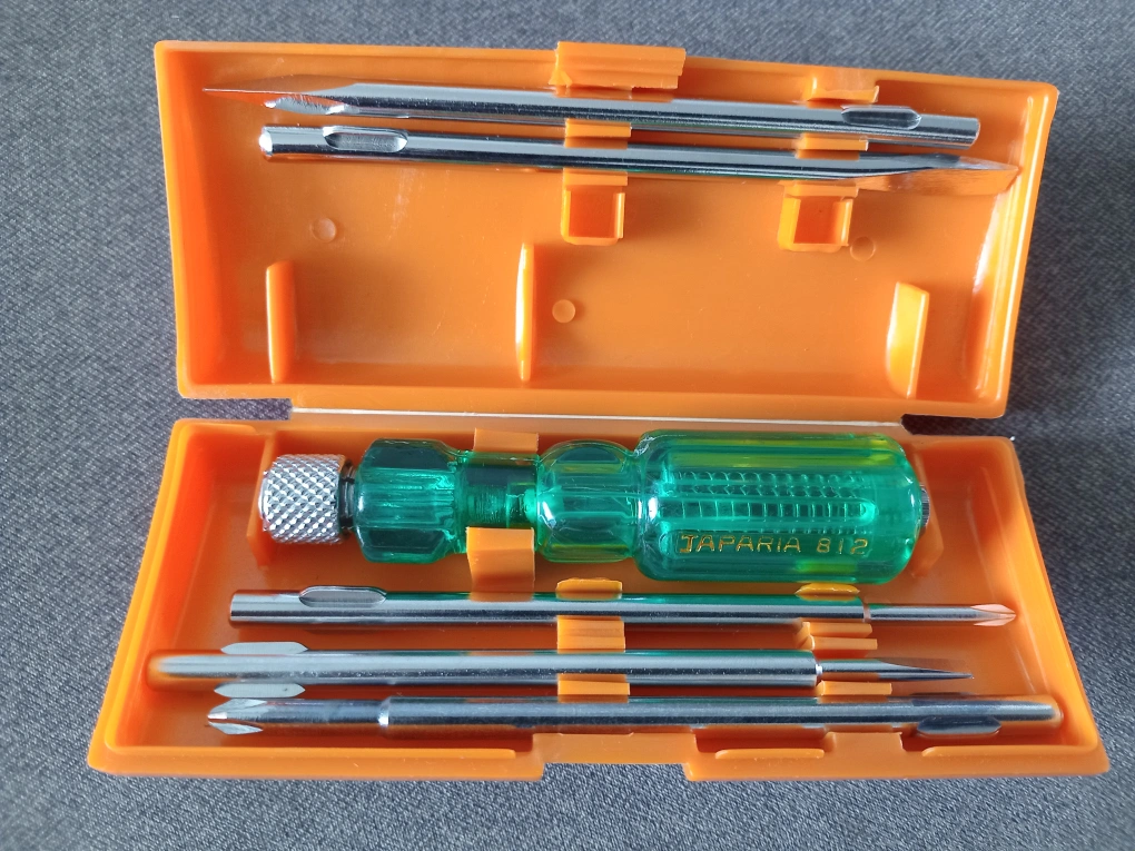 Selling a Taparia 812 screwdriver set! It comes with five different blades, including a poker, all neatly stored in its original orange case. This set is perfect for various tasks around the house or in your workshop