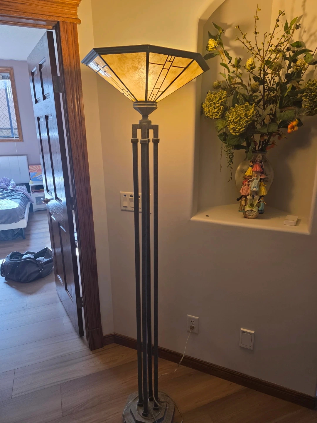 This is a Tiffany-style floor lamp with a geometric shade. It features a metal stand and a decorative base. Provides warm ambient lighting.