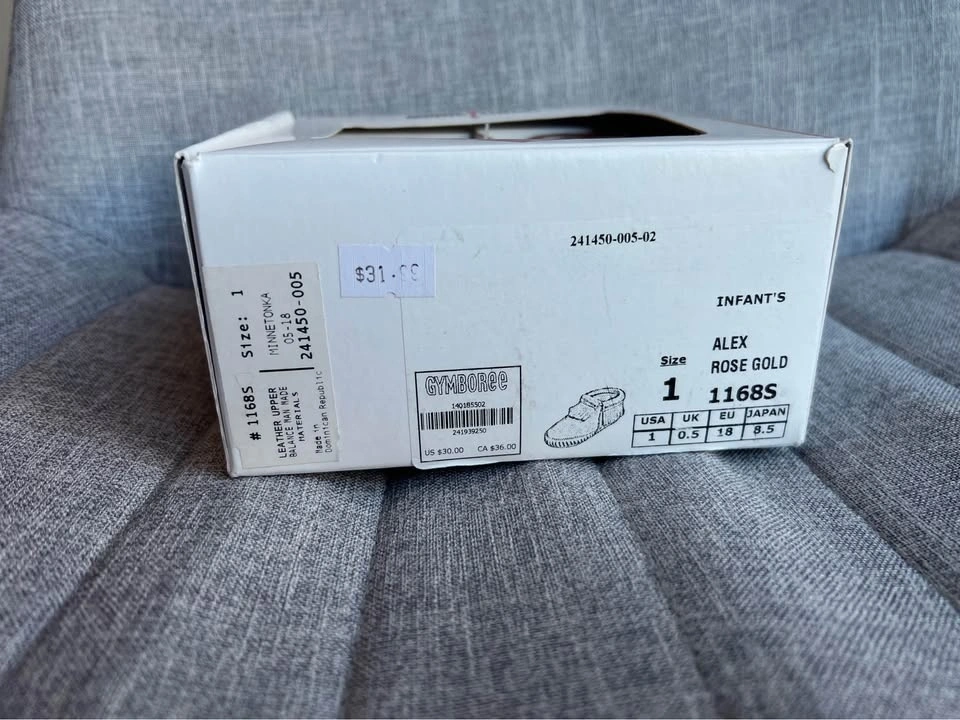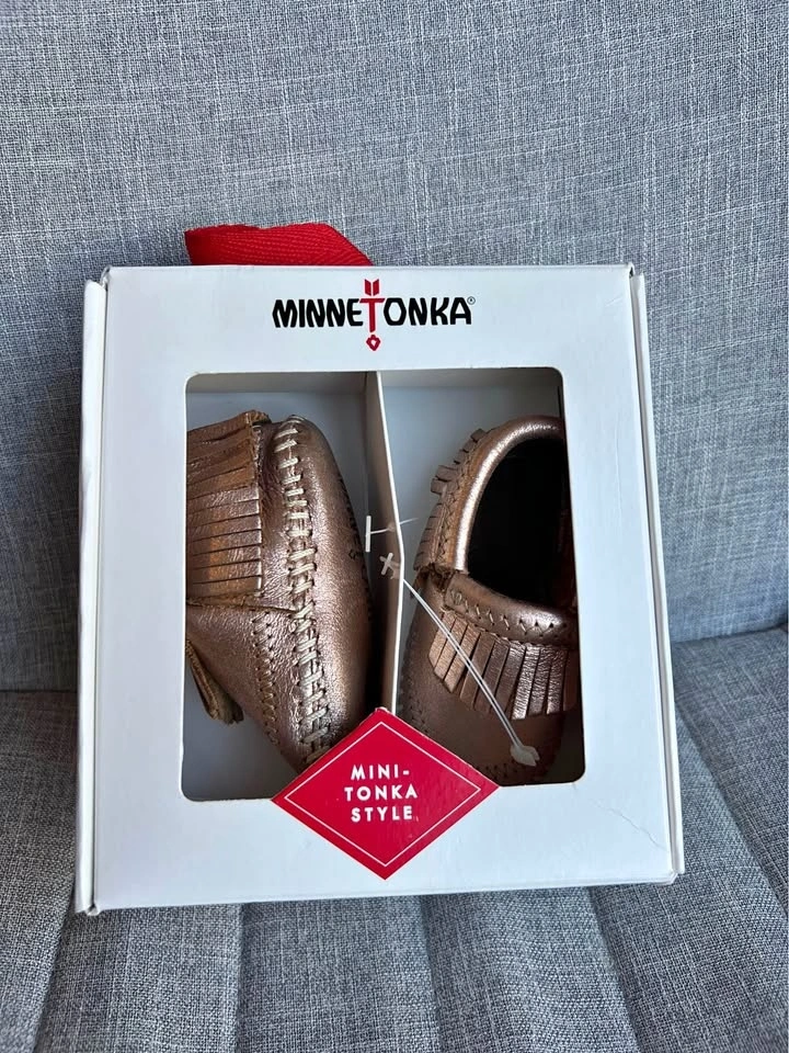 Brand new in box, never worn. Rose gold metallic leather with fringe detail — so cute for a baby gift or special occasion! Size 1 (fits 3–6 months). Leather upper. Comes in original Minnetonka box. Pick up only — Woodbine & Elgin Mills, Markham.
