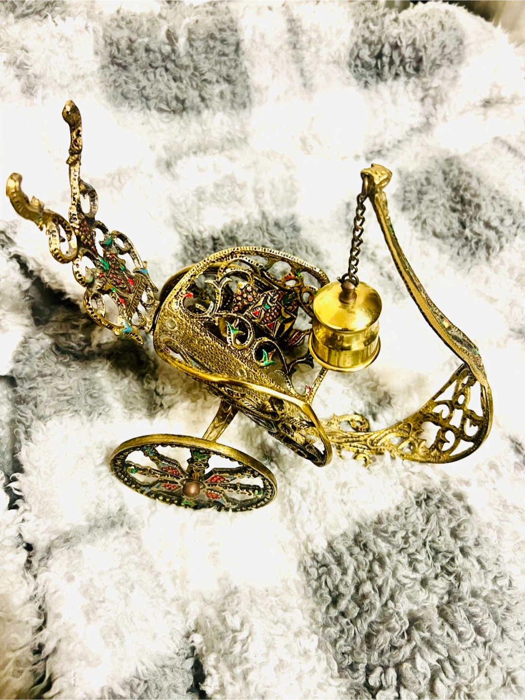 This ornate brass carriage-shaped holder features intricate filigree detailing and colourful enamel accents. It has a small chain with a bell attached. This decorative piece would make a unique addition to any curio cabinet or shelf.