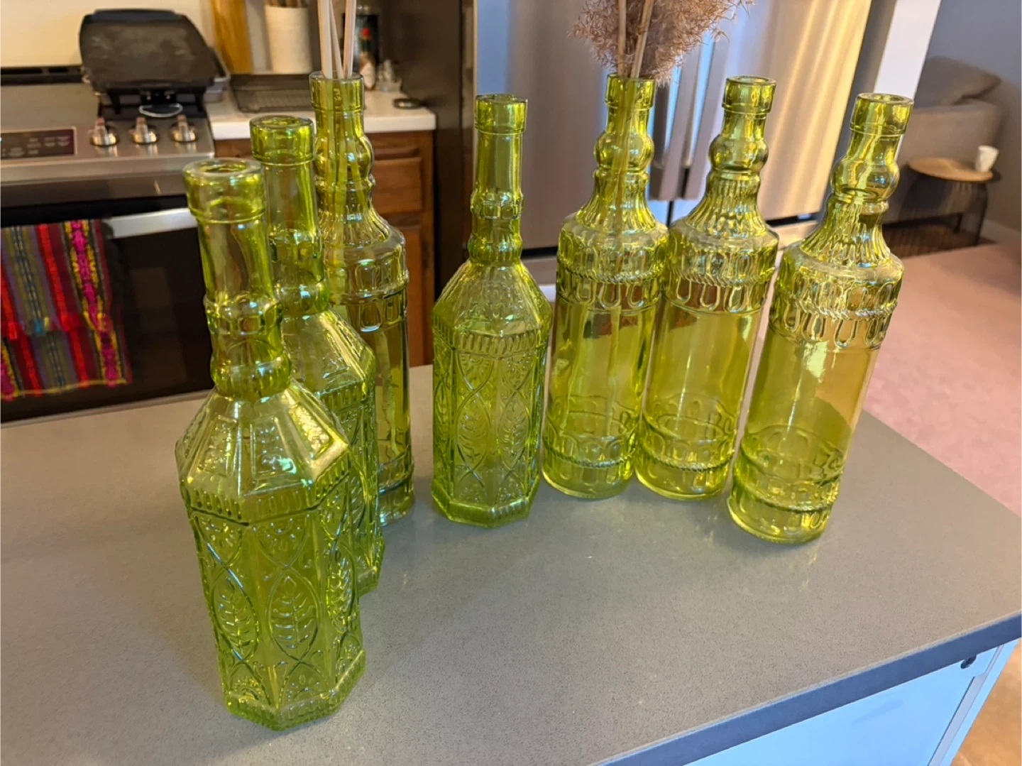 This is a set of seven green glass vases with an embossed floral pattern. They're perfect for displaying dried flowers or small bouquets. Adds a pop of colour and vintage charm to any room!