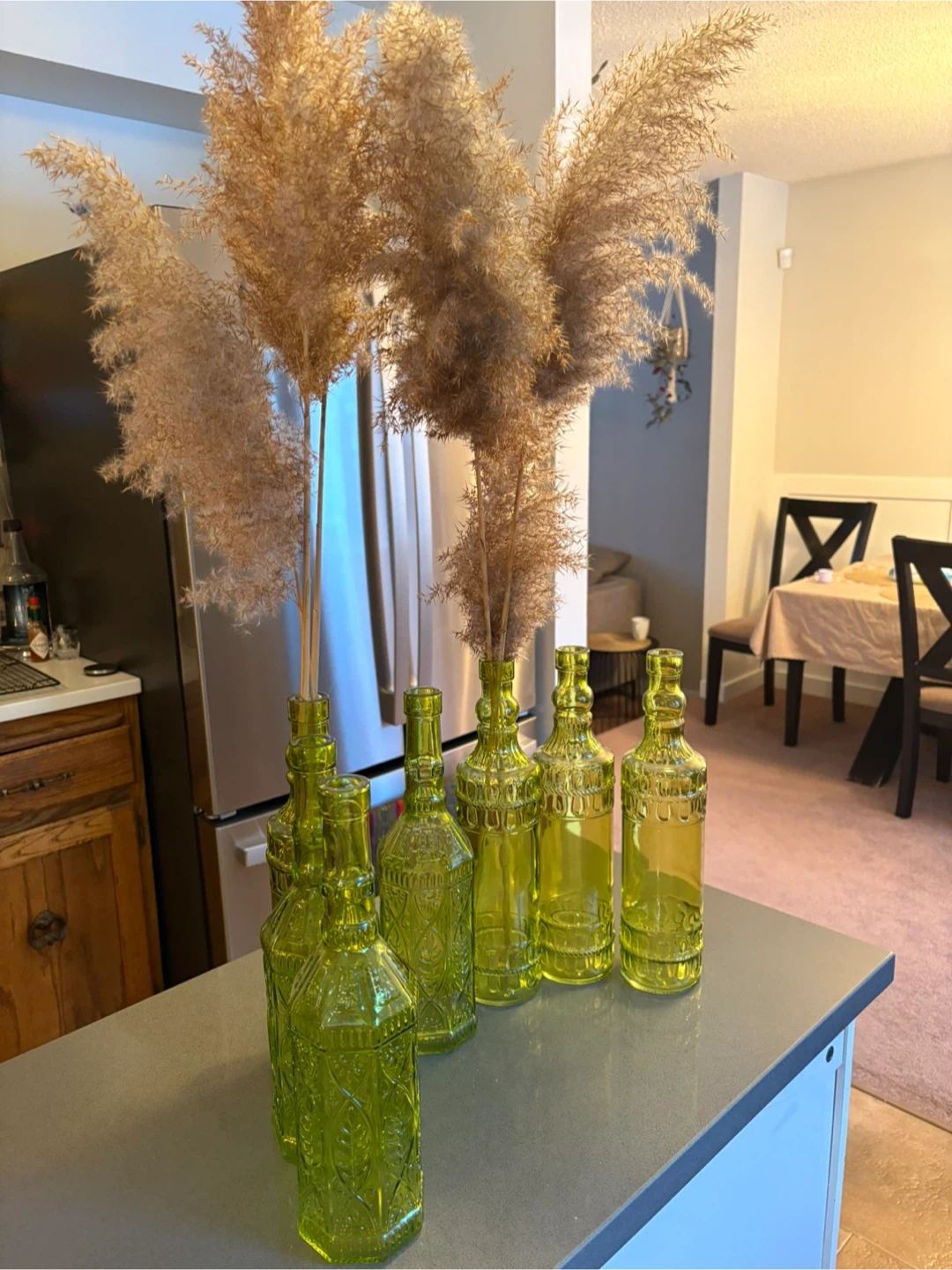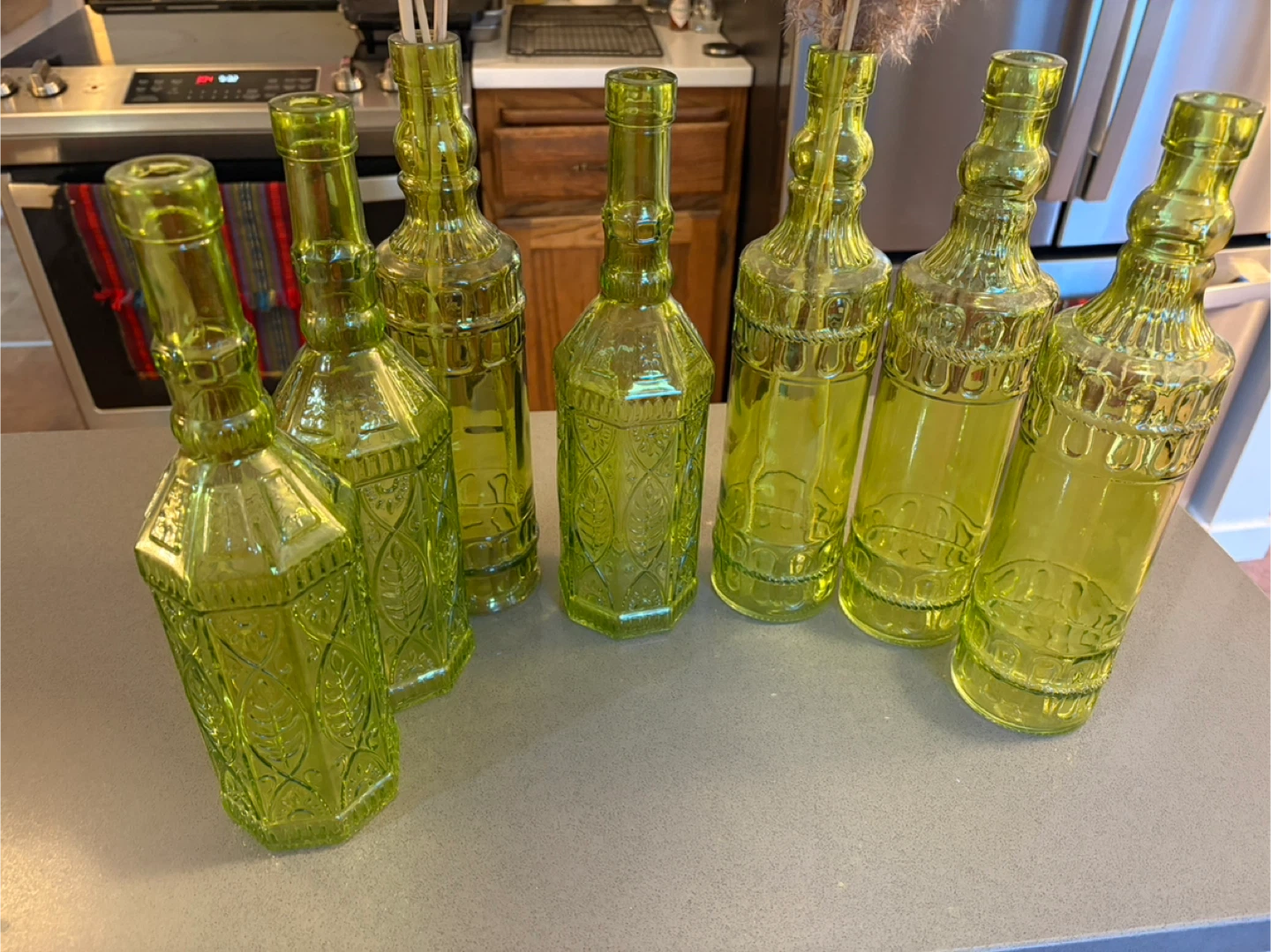 This is a set of seven green glass vases with an embossed floral pattern. They're perfect for displaying dried flowers or small bouquets. Adds a pop of colour and vintage charm to any room!