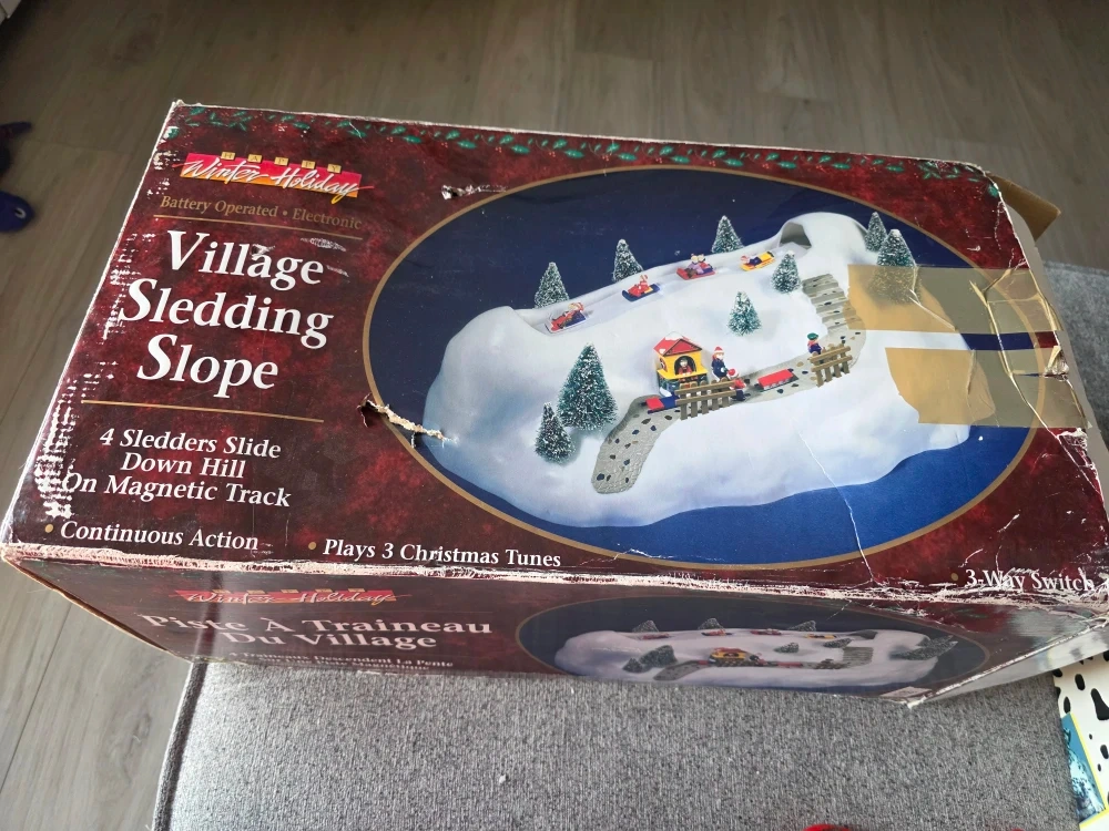 Selling a Winter Holiday Village Sledding Slope. It's battery operated and plays 3 Christmas tunes! It also has 4 sledders that slide down the hill on a magnetic track for continuous action. Original Box included! Works but the sledders are a little slow and they do stop moving for a bit before starting again. In have a video in could send you.