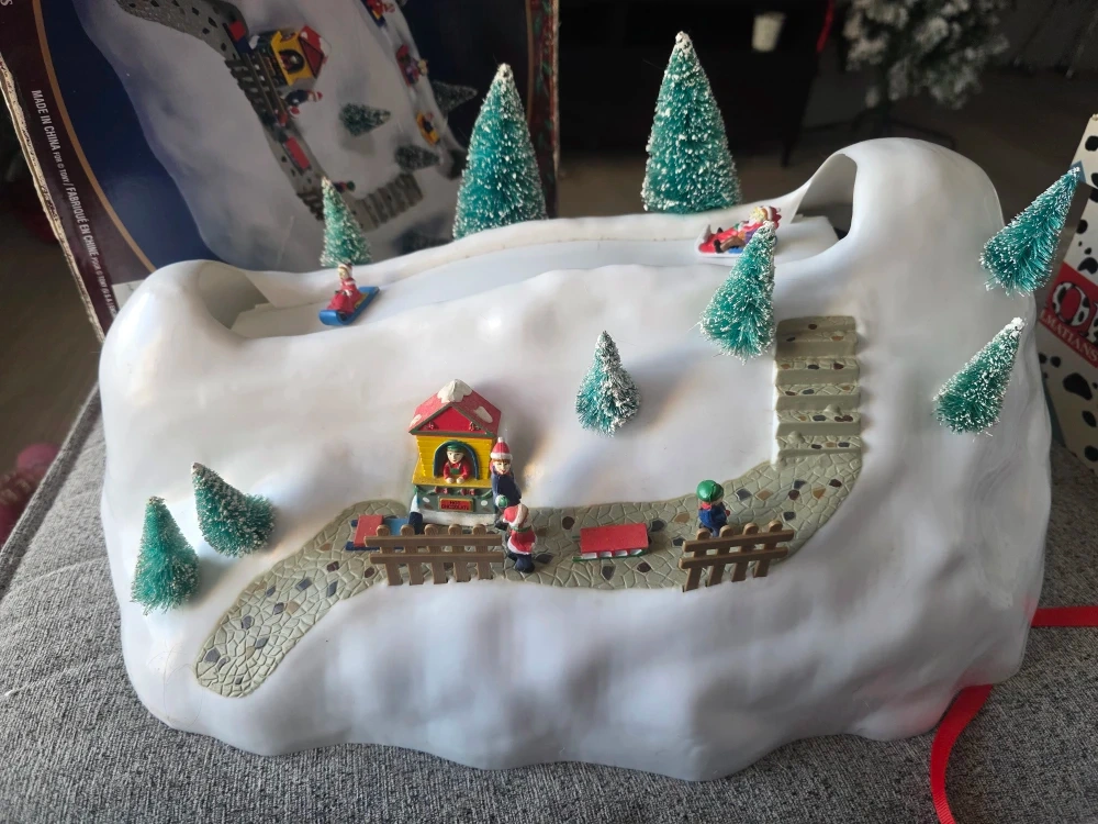 Selling a Winter Holiday Village Sledding Slope. It's battery operated and plays 3 Christmas tunes! It also has 4 sledders that slide down the hill on a magnetic track for continuous action. Original Box included! Works but the sledders are a little slow and they do stop moving for a bit before starting again. In have a video in could send you.