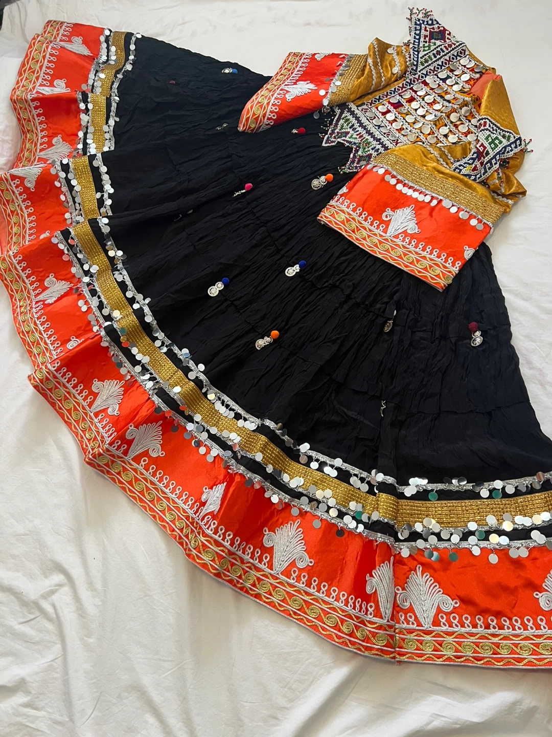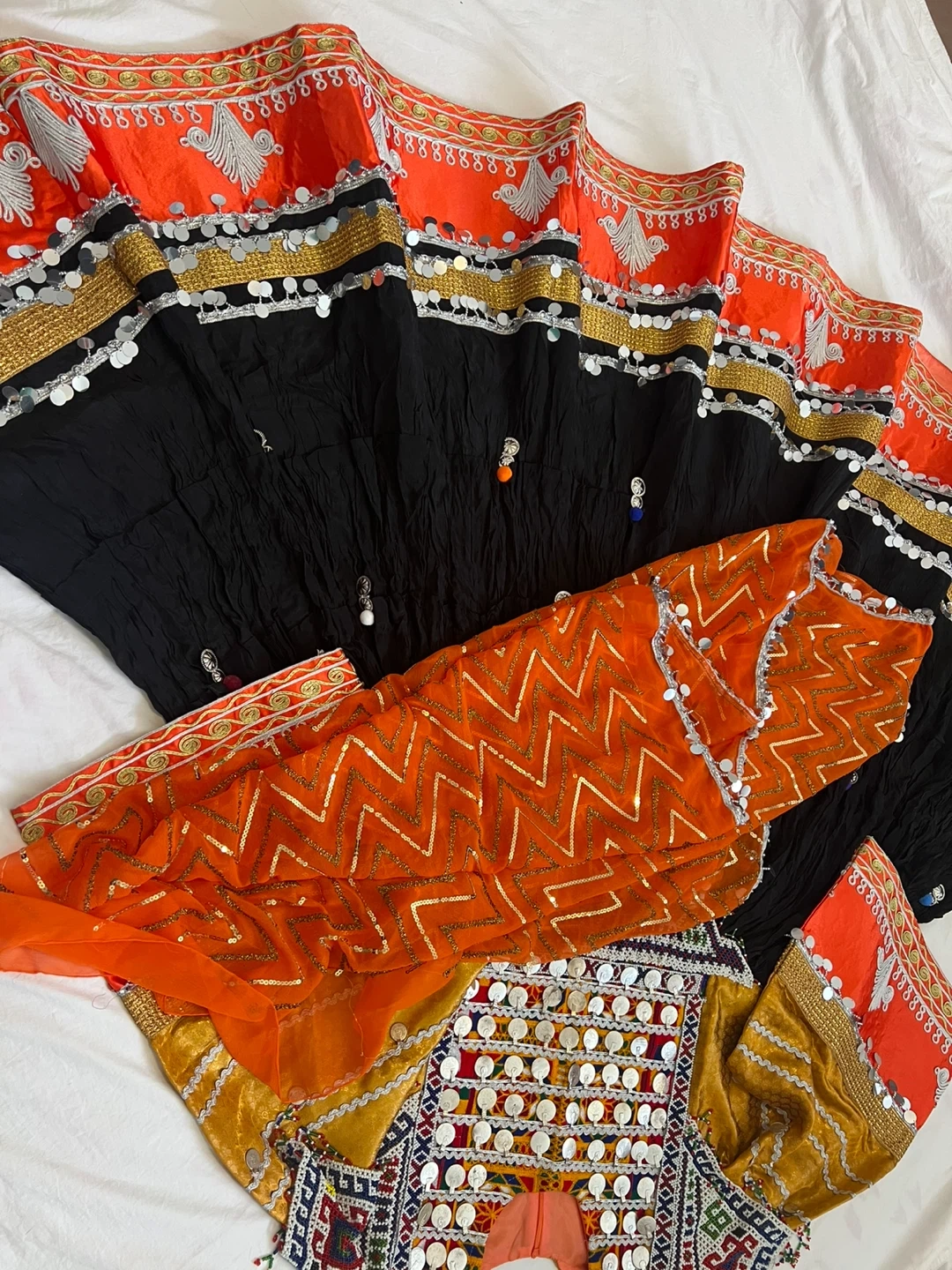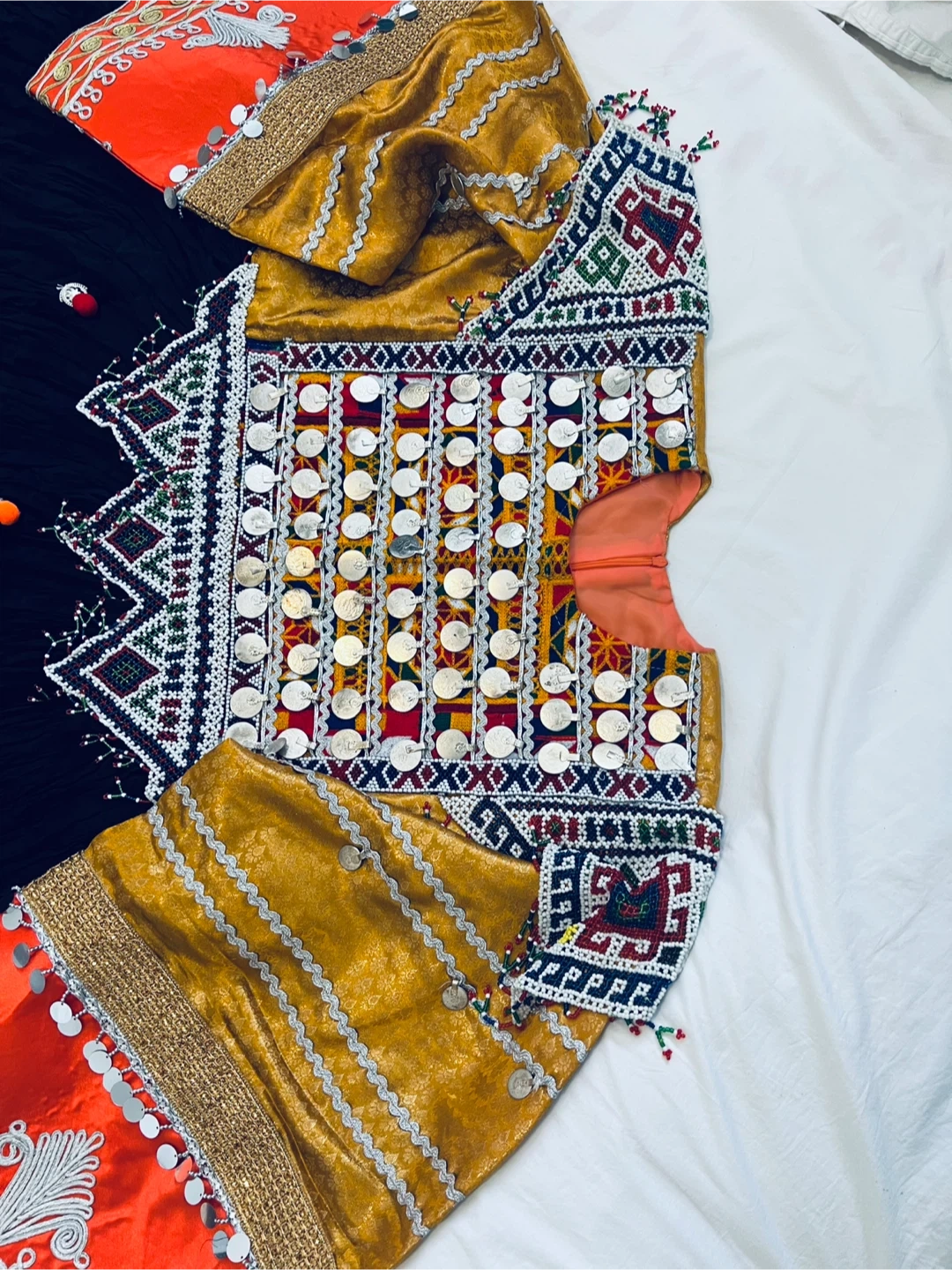 This is a beautiful black Afghan dress adorned with vibrant orange embroidered trim. It features intricate beadwork and sequin embellishments throughout. The set includes the dress and matching sleeves. It's perfect for cultural events or festive occasions!