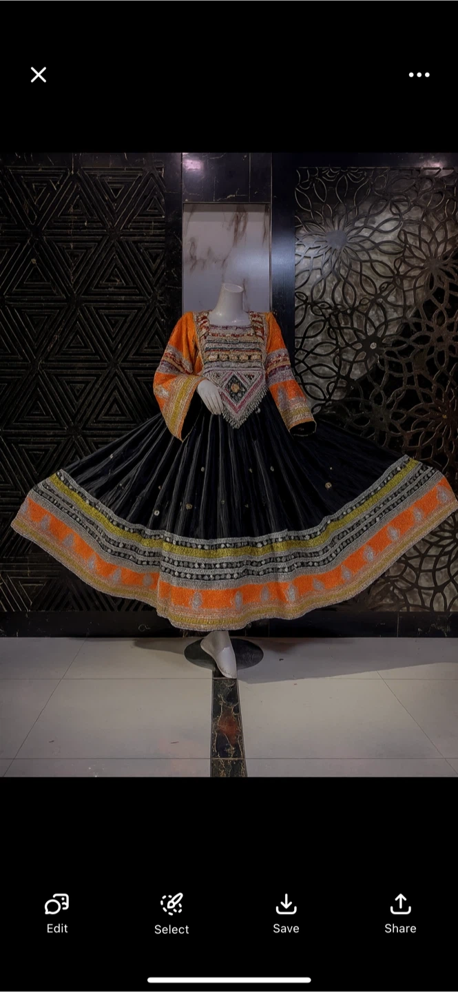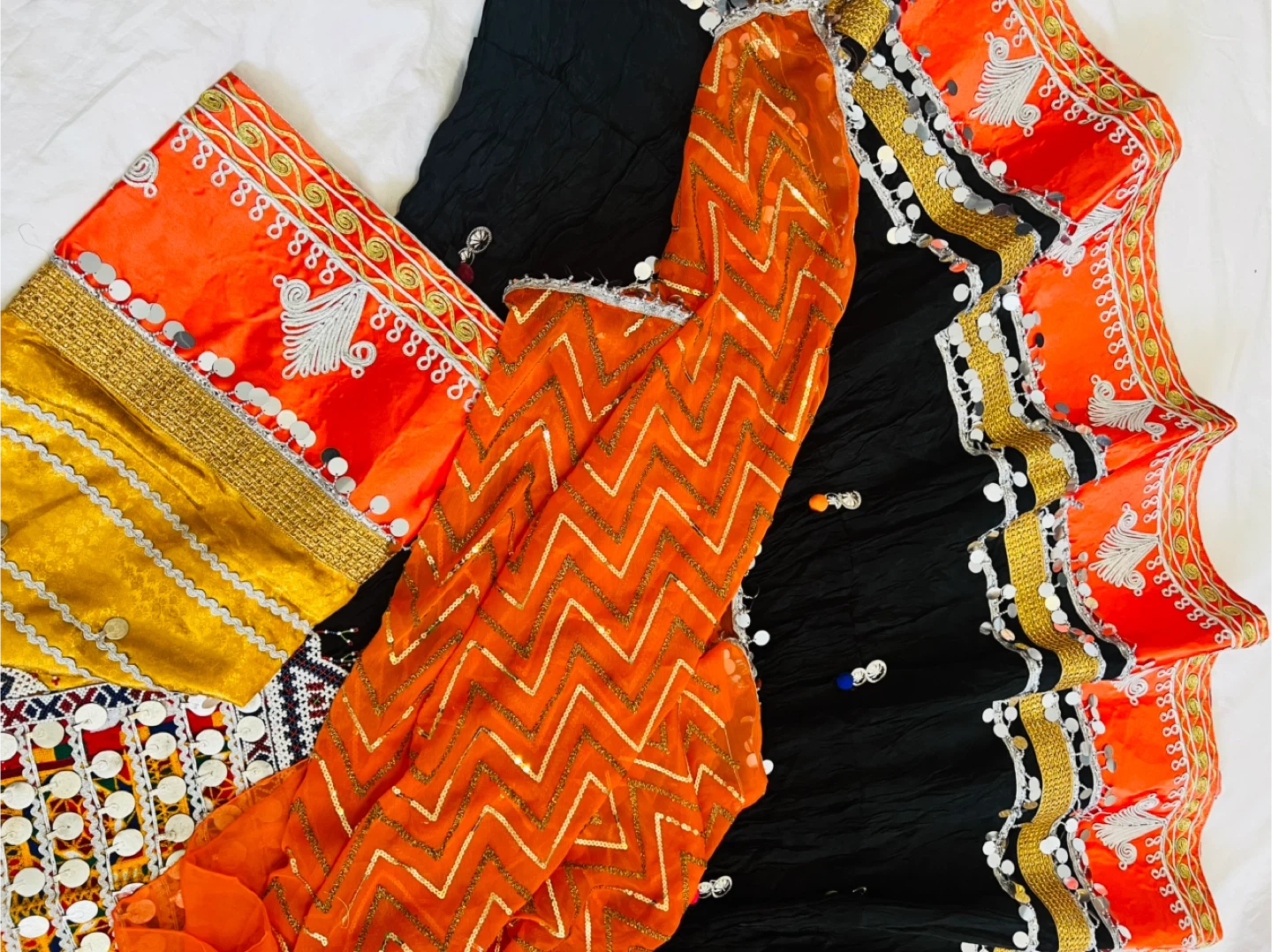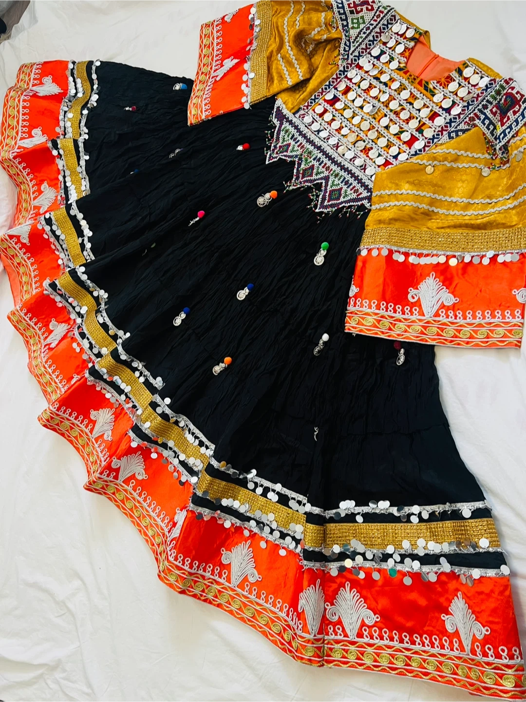 This is a beautiful black Afghan dress adorned with vibrant orange embroidered trim. It features intricate beadwork and sequin embellishments throughout. The set includes the dress and matching sleeves. It's perfect for cultural events or festive occasions!