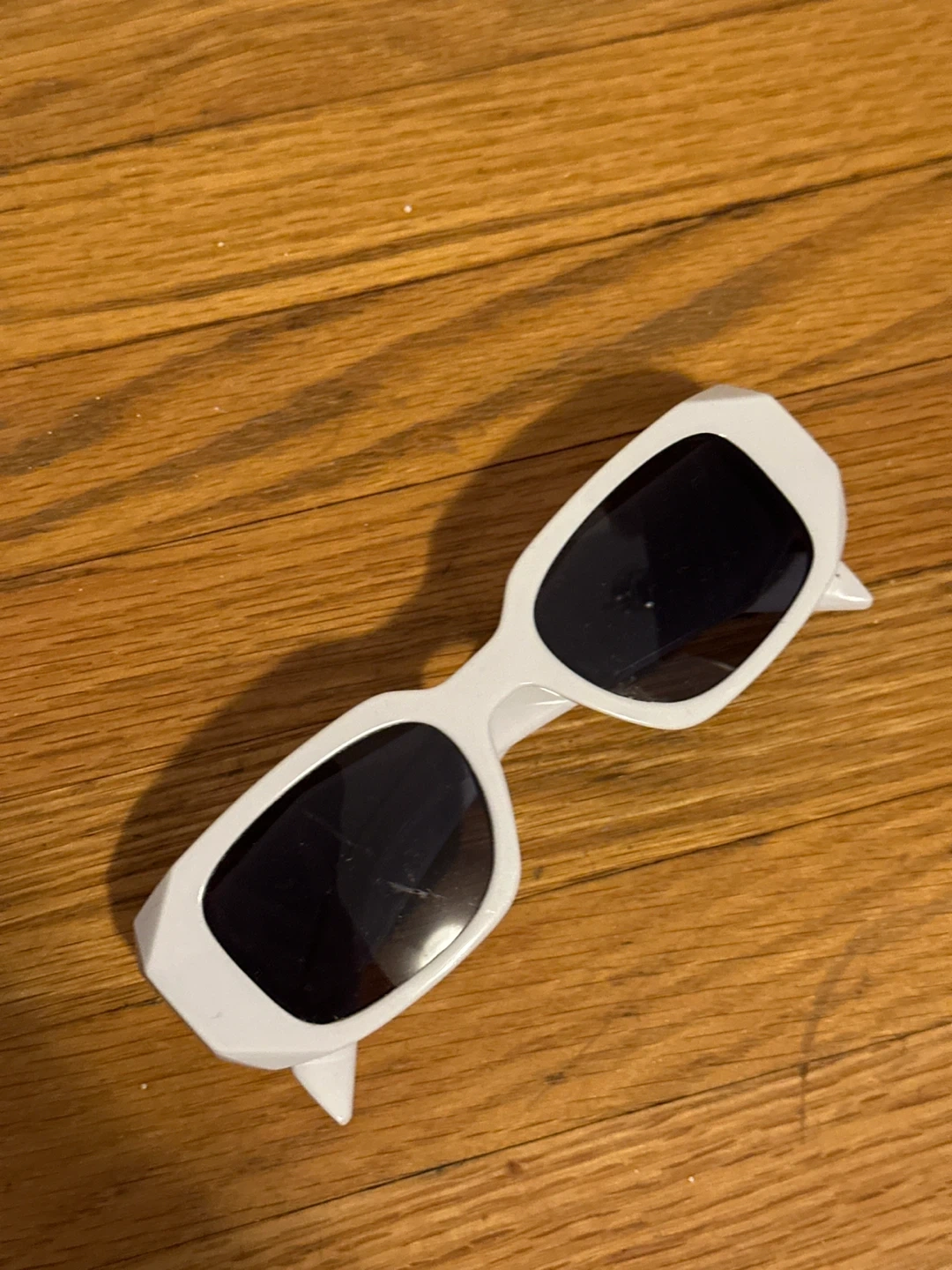 White rectangular sunglasses with dark lenses. These shades have a bold, angular frame design. They're great for adding a statement to any outfit!