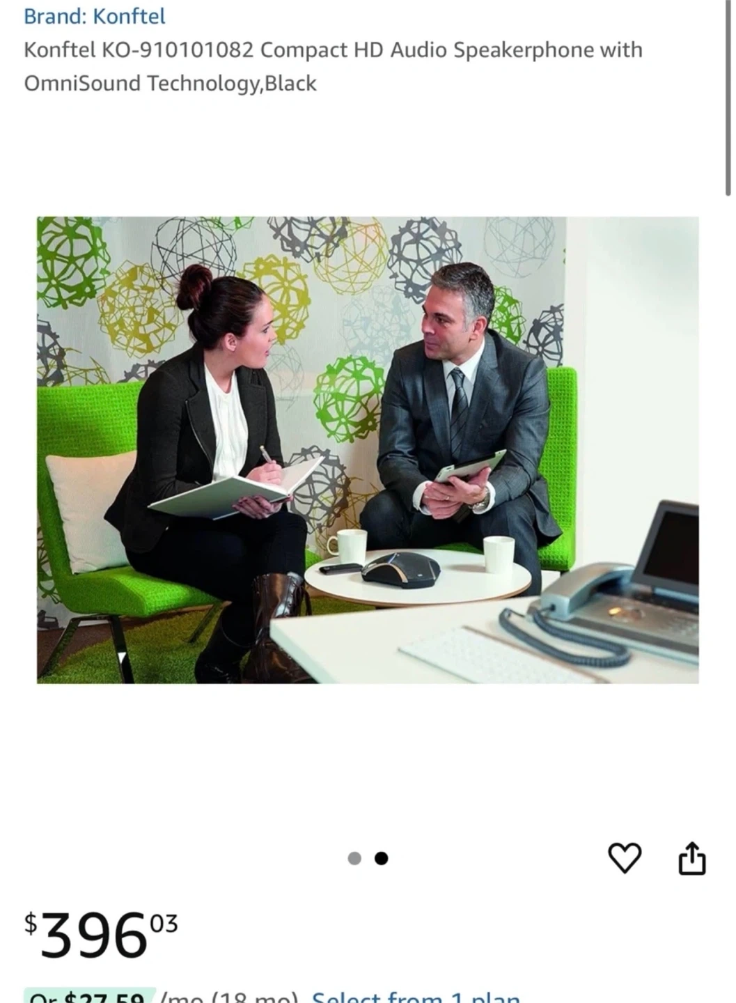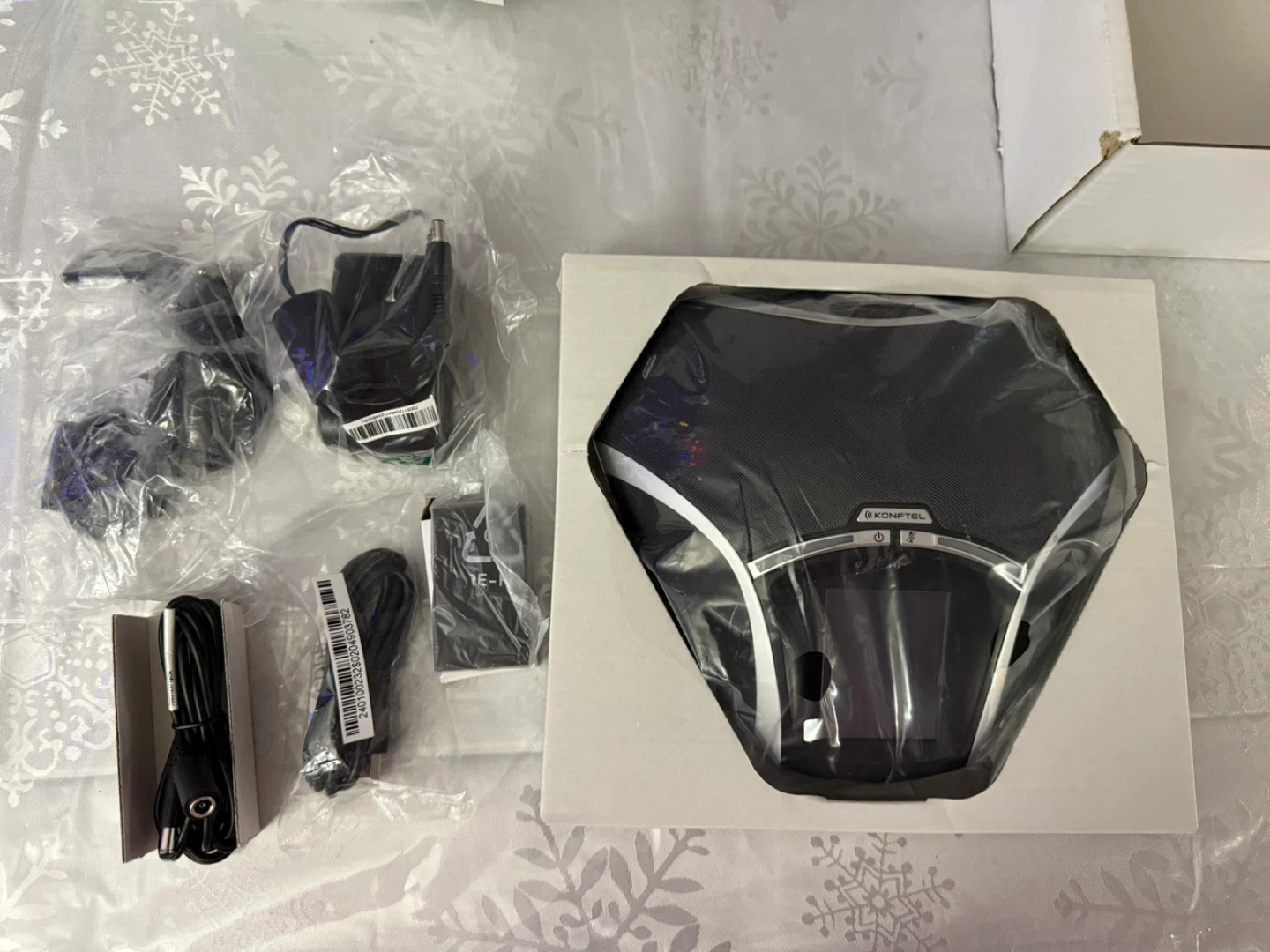 This is a Konftel KO-910101082 compact HD audio speakerphone. It features OmniSound Technology and comes in black. Includes all original accessories and box. It's great for conference calls and remote meetings!