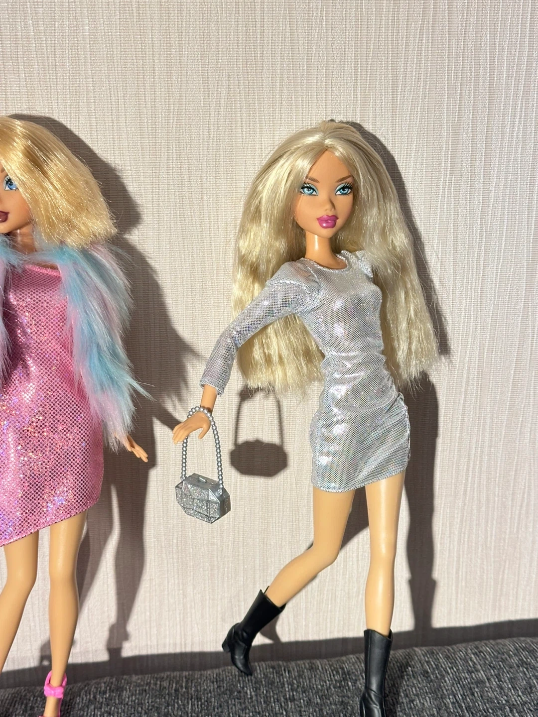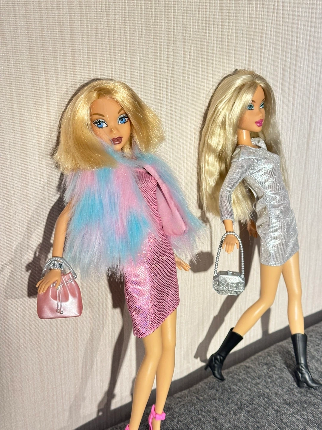 Two My Scene fashion dolls dressed in sparkly outfits. One doll wears a silver sequined dress with black boots and a matching purse. The other doll sports a pink glitter dress with a fluffy pink, blue, and purple boa and a pink purse. It's playtime fashion fun!