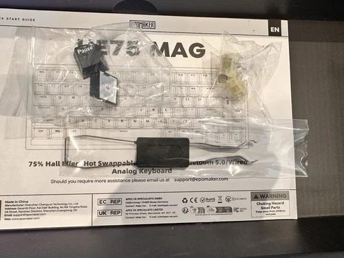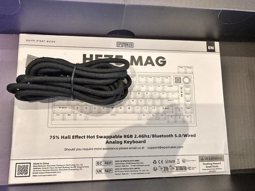 Open box, unused and in like-new condition. Box may show light handling wear. Fully tested and works perfectly. Features a 75% compact layout with Hall Effect magnetic switches for smooth, wobble-free typing and gaming. Includes Rapid Trigger for ultra-fast actuation and hot-swappable switches for customization. Comes with a replaceable knob and 2 extra keys. Tri-mode connectivity: USB-C wired, 2.4GHz wireless (dongle included), and Bluetooth. Customizable RGB backlighting with multiple effects. Magnetic structure for consistent key feel and durable build quality. The HE75 allows precise actuation distance adjustment from 0.1mm to 4.0mm. The interchangeable knob module offers flexible controls. Equipped with DKS and MT for dynamic functionality, and Snap Tap for quick game navigation. Features onboard memory for four modes: Comfort, Sensitive, Gaming, and Custom. The 75% ANSI US layout has 81 keys. It has south-facing LEDs and 83 durable, oil-resistant PBT keycaps. Built-in 4000mAh rechargeable battery provides up to 120 hours of battery life with backlight off.