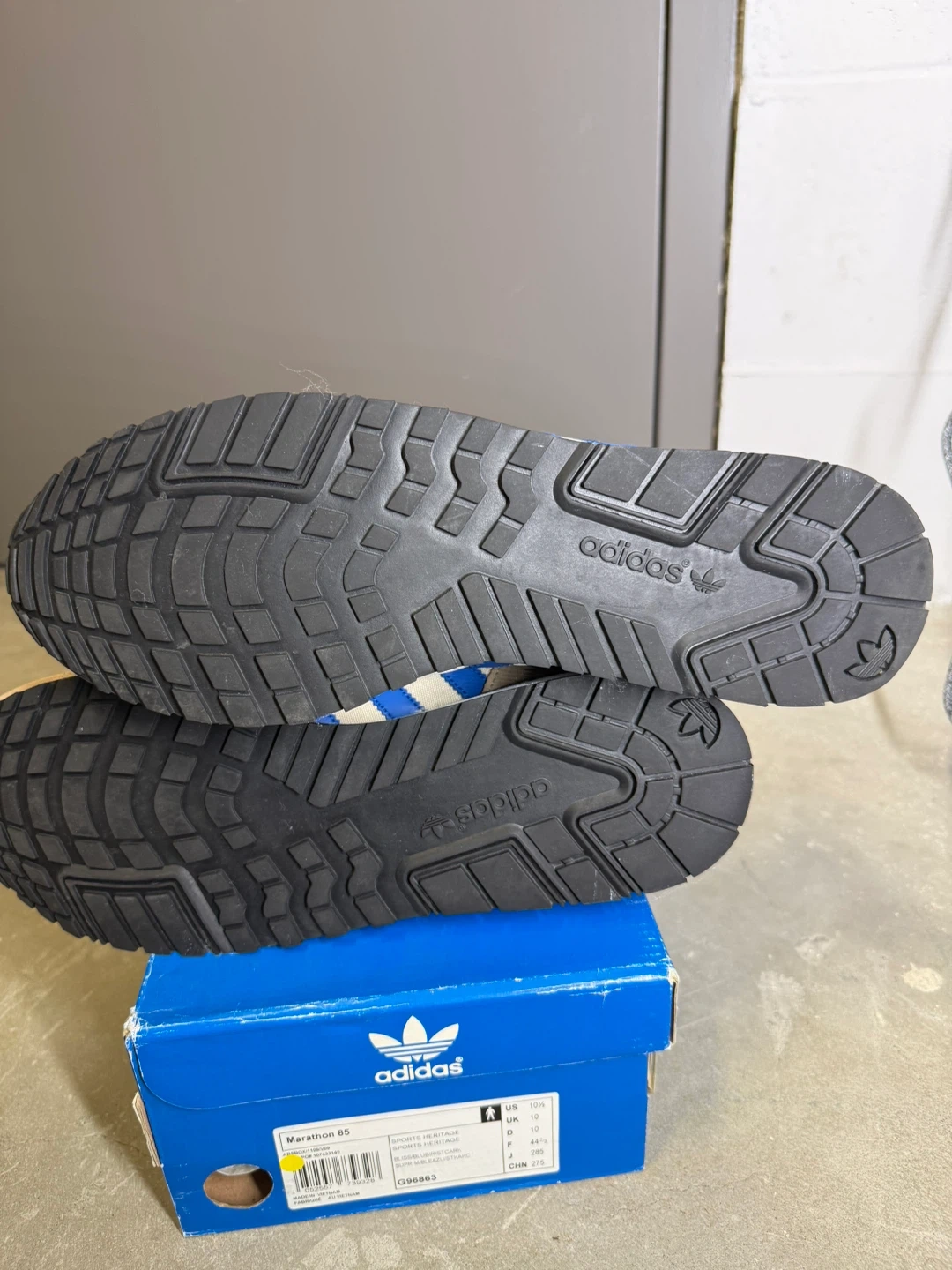 Adidas Marathon 85 "Sports Heritage" sneakers in a beige and blue colourway. These shoes come with their original box and extra black laces. They feature a classic retro design perfect for everyday wear. Wear once. Super clean.