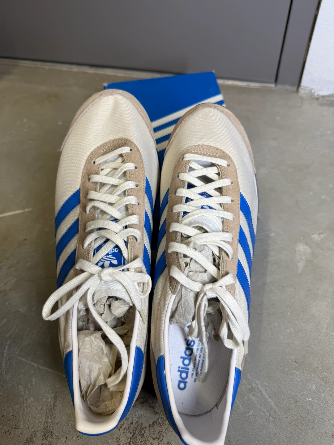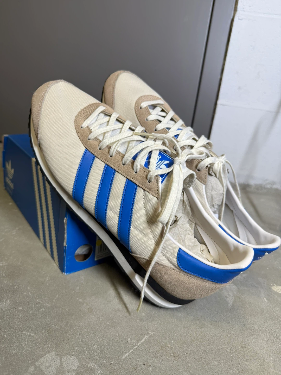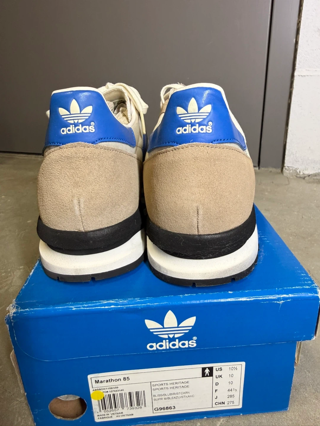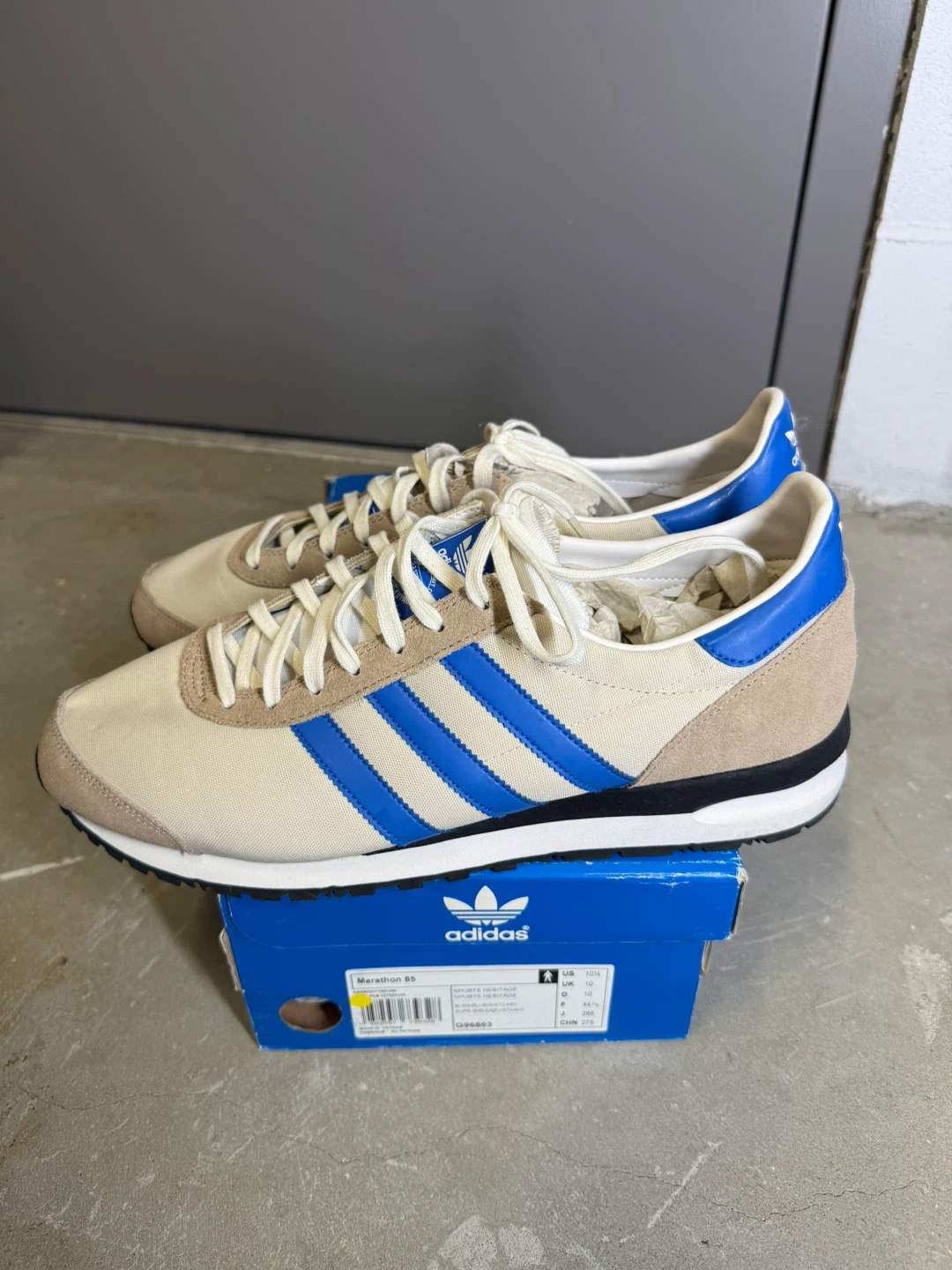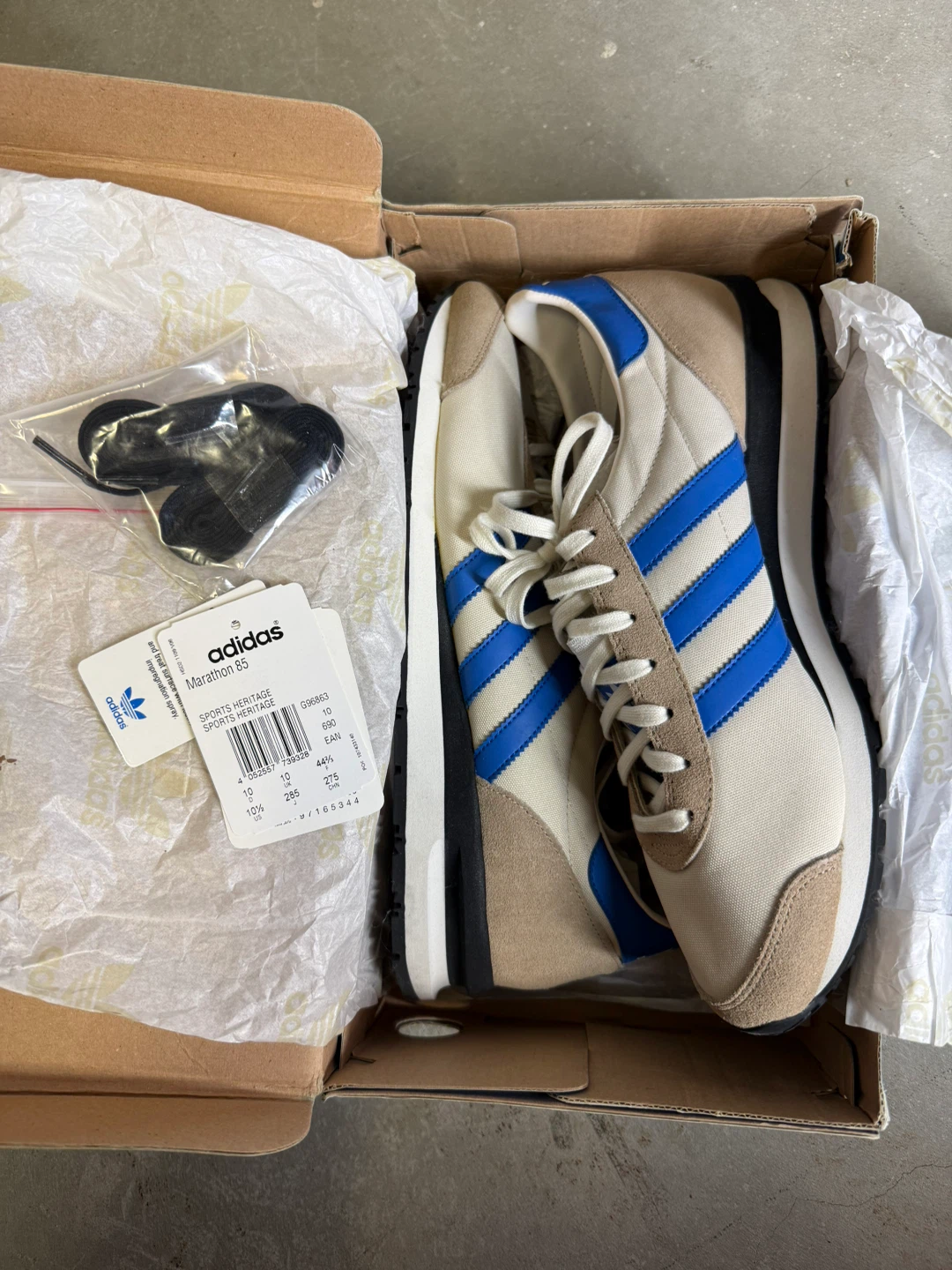 Adidas Marathon 85 "Sports Heritage" sneakers in a beige and blue colourway. These shoes come with their original box and extra black laces. They feature a classic retro design perfect for everyday wear. Wear once. Super clean.