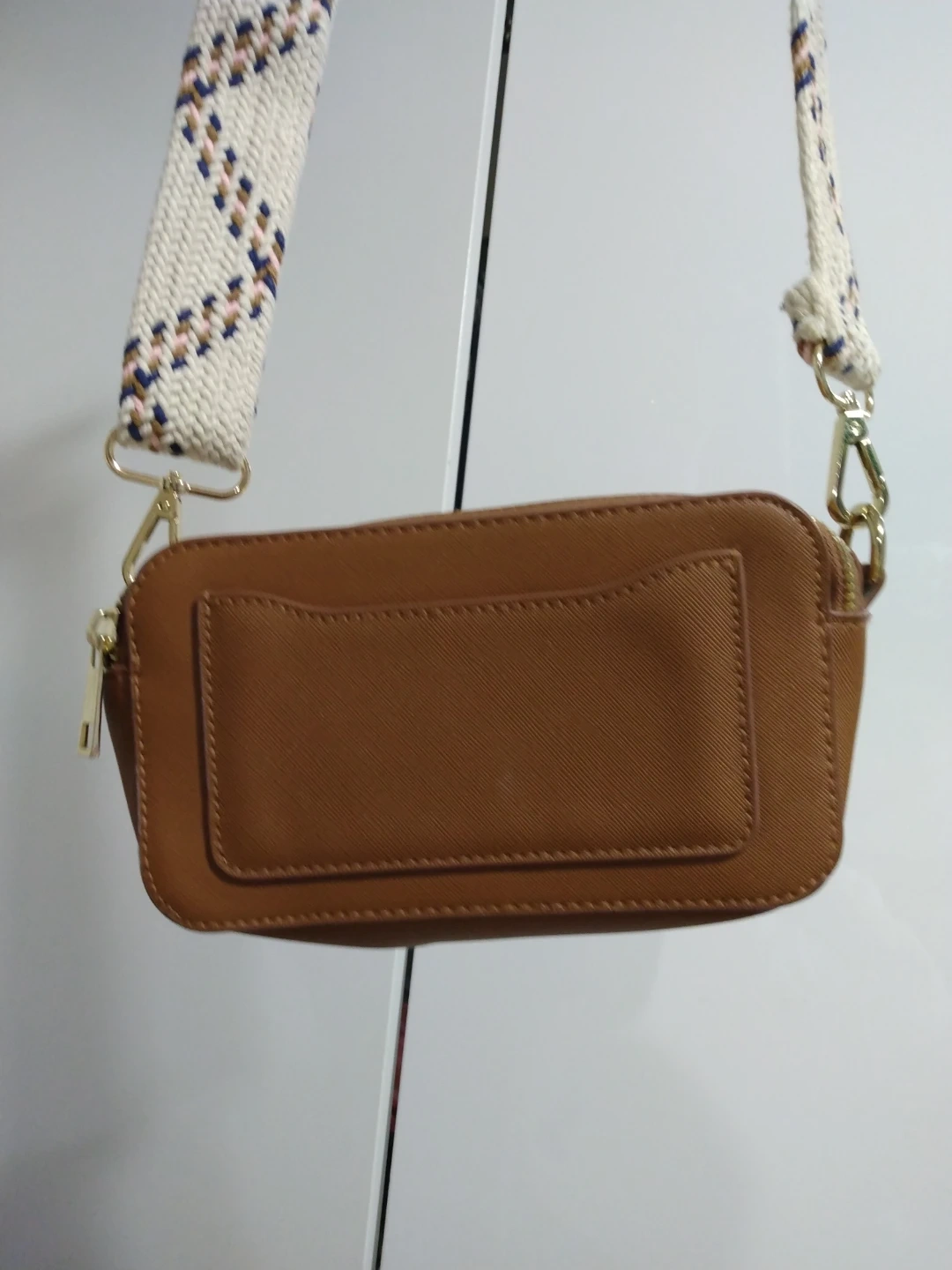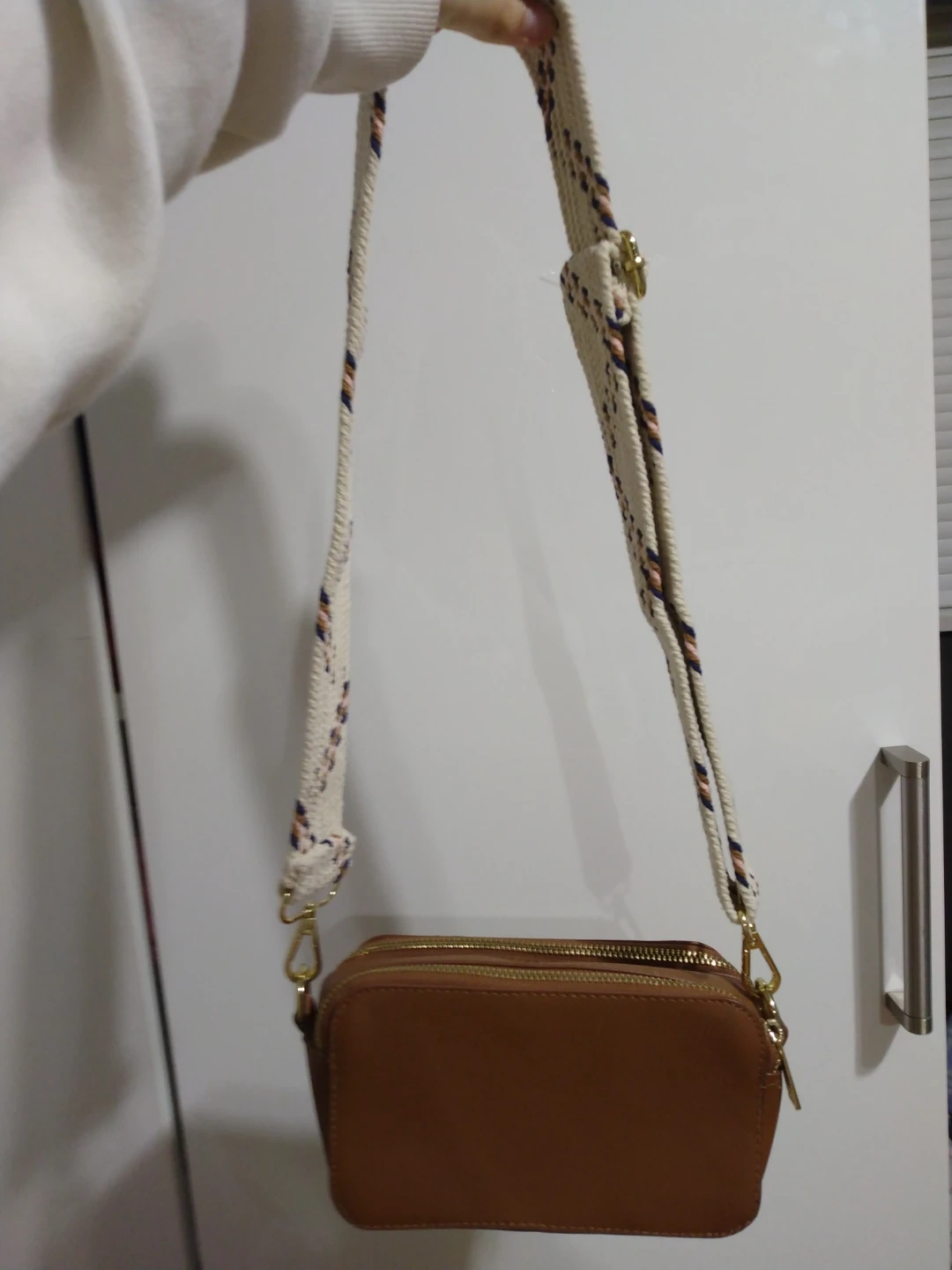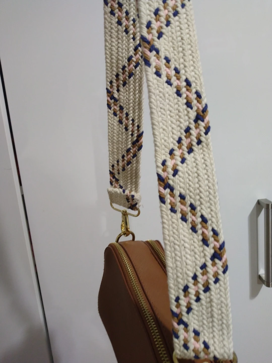 crossbody bag in a rich brown colour. It features a woven strap with a blue, pink, and tan diamond pattern. The bag has a main zippered compartment and a handy back pocket.