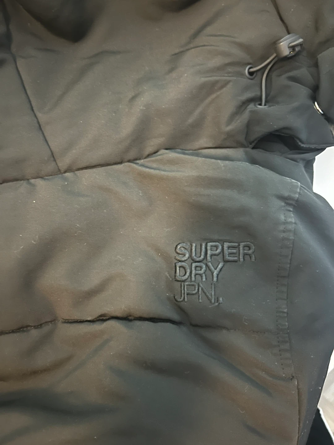 Black puffer jacket from Superdry. Features a faux fur lined hood and quilted interior. Durable construction for cold weather. Great for everyday wear!