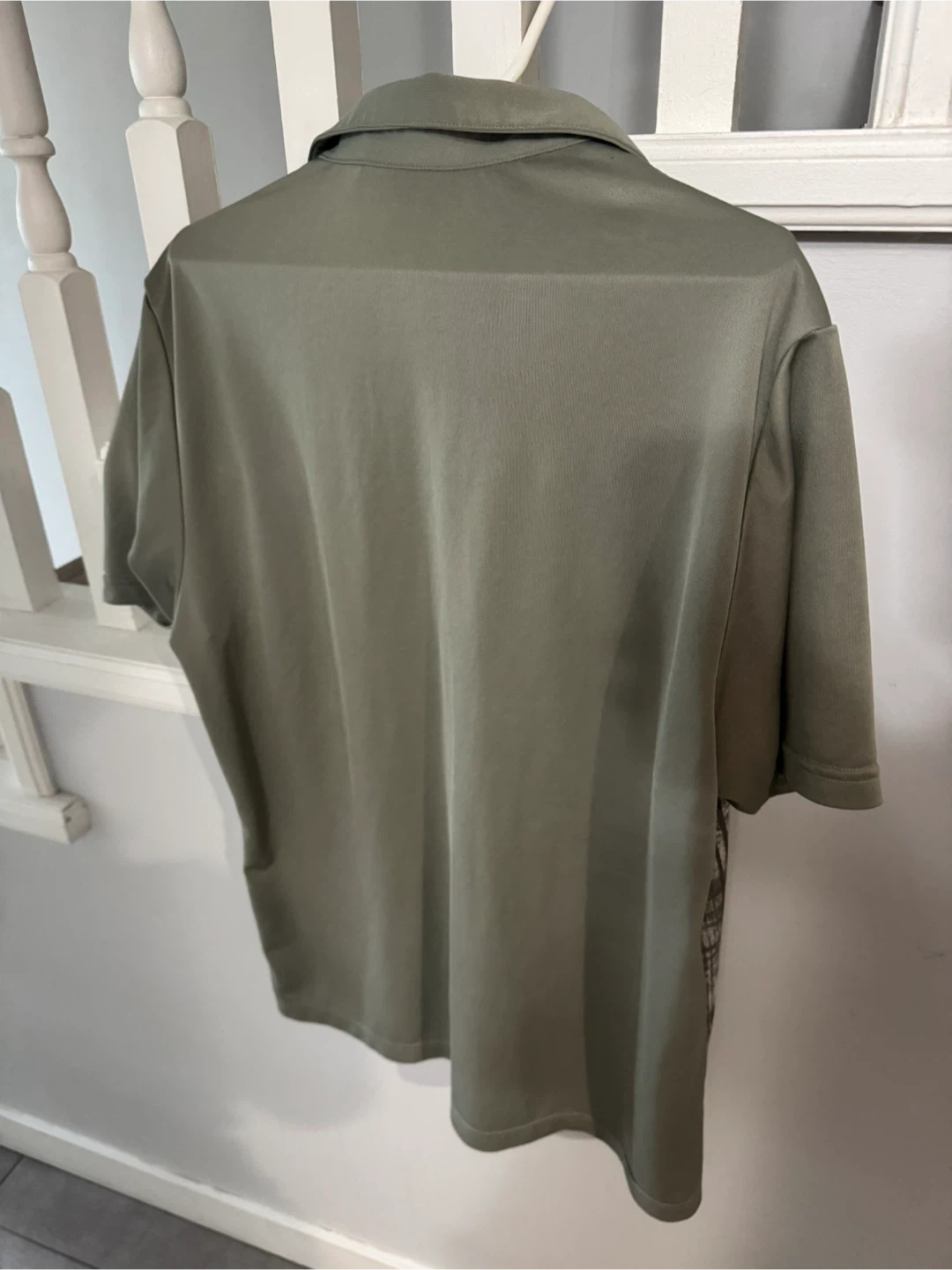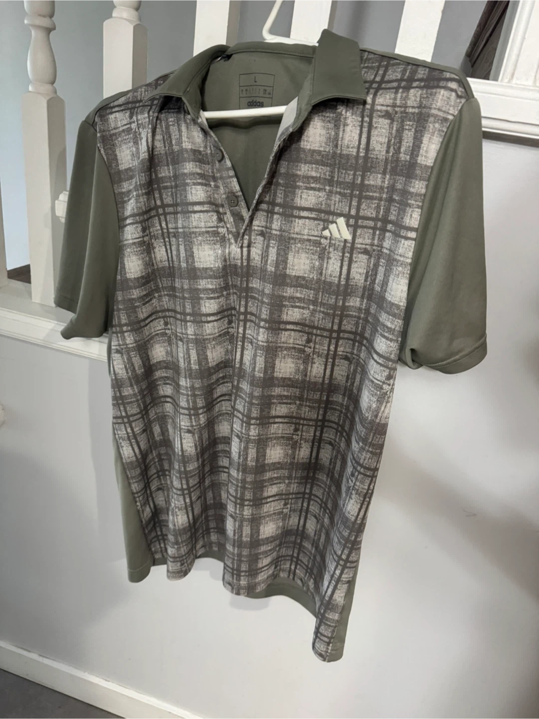 Men's Adidas golf polo shirt in a size large. It's olive green with a grey and white plaid pattern on the front. Short sleeves and a collared neckline. Feels super smooth and great for athletic gear or business casual gatherings, with a really unique colour!