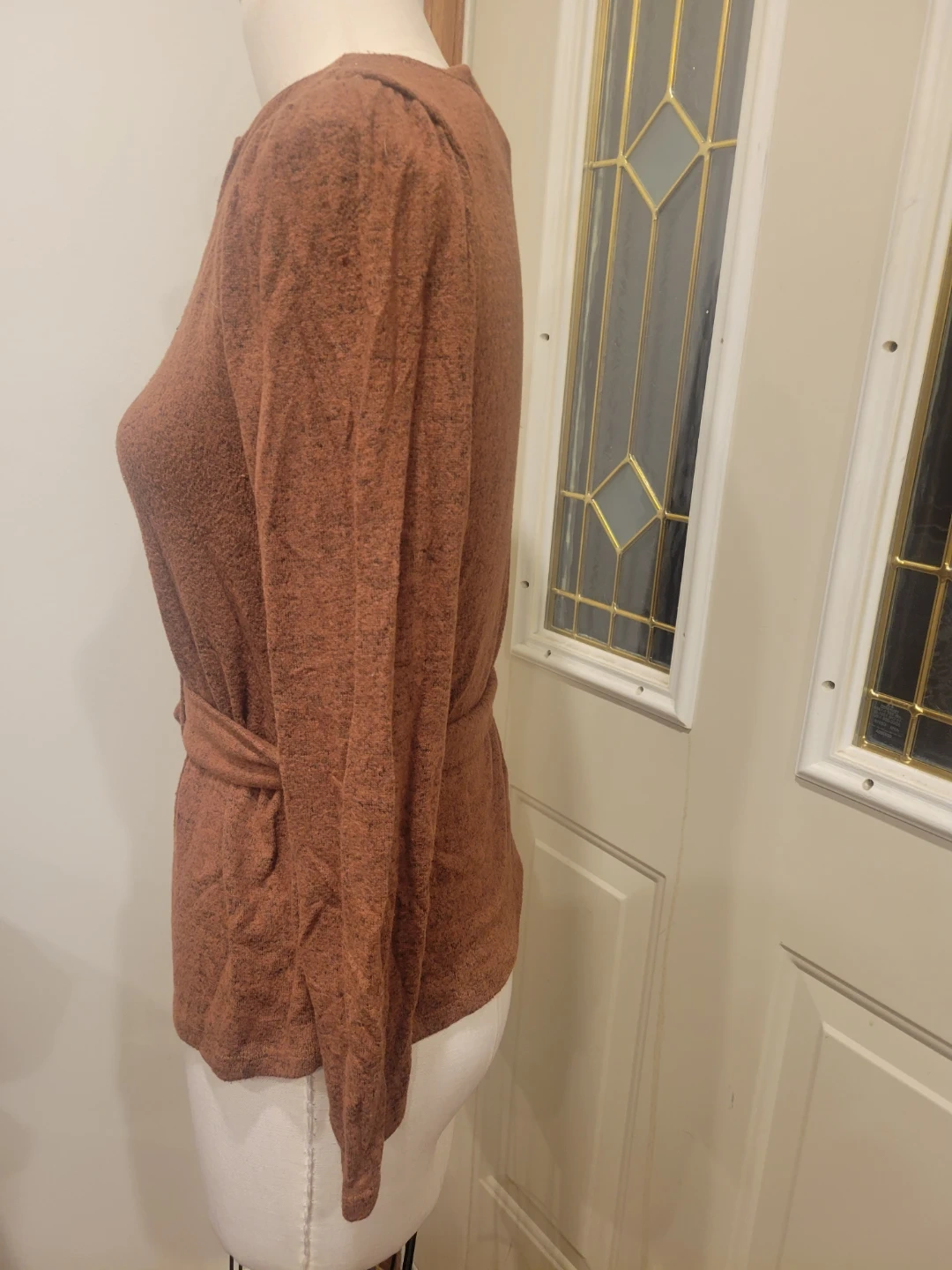 This Monteau top features long sleeves and a flattering wrap style. It's made from a soft, textured fabric. Size is small with removable belt has a small mark can see in last picture pickup location eglinton and dufferin area