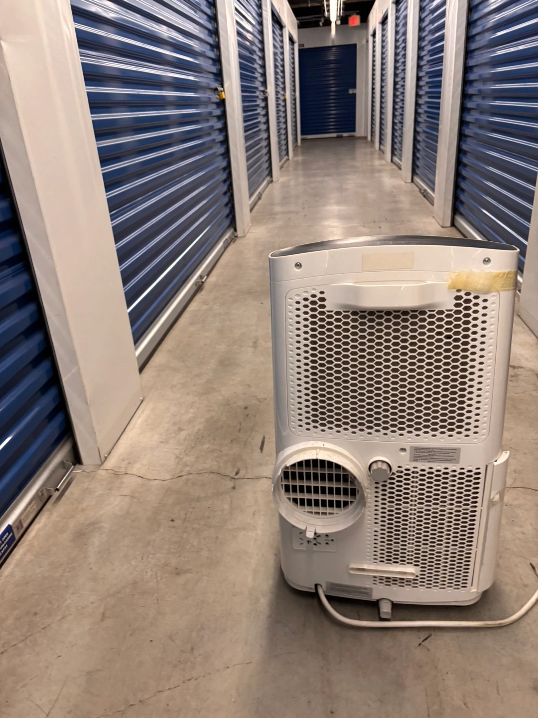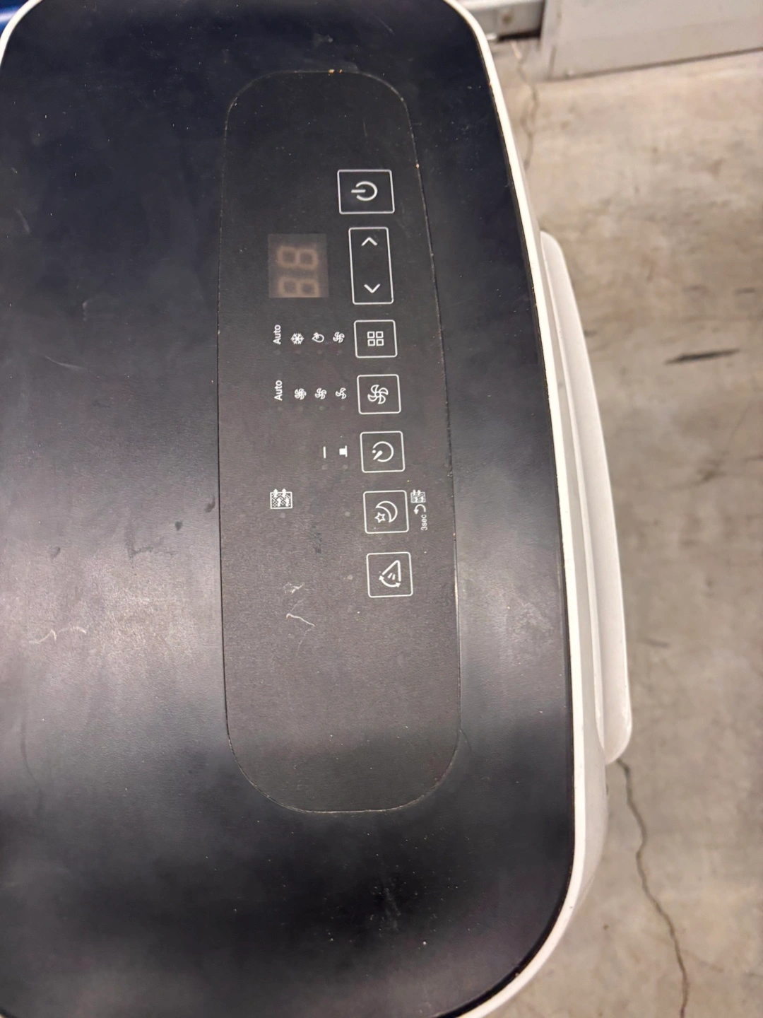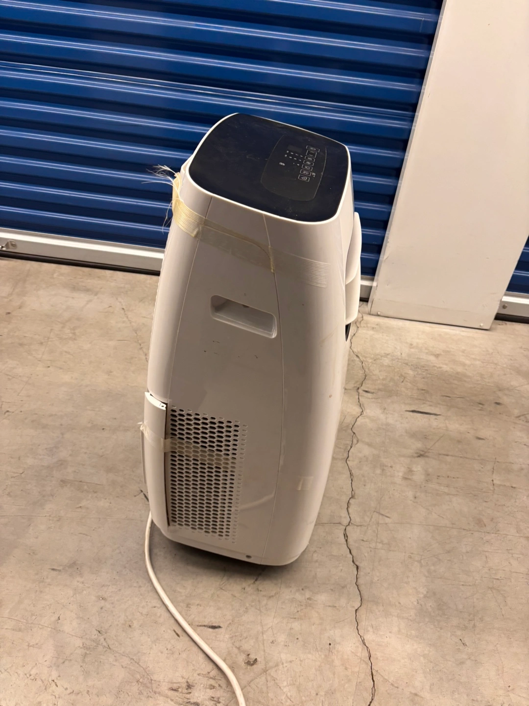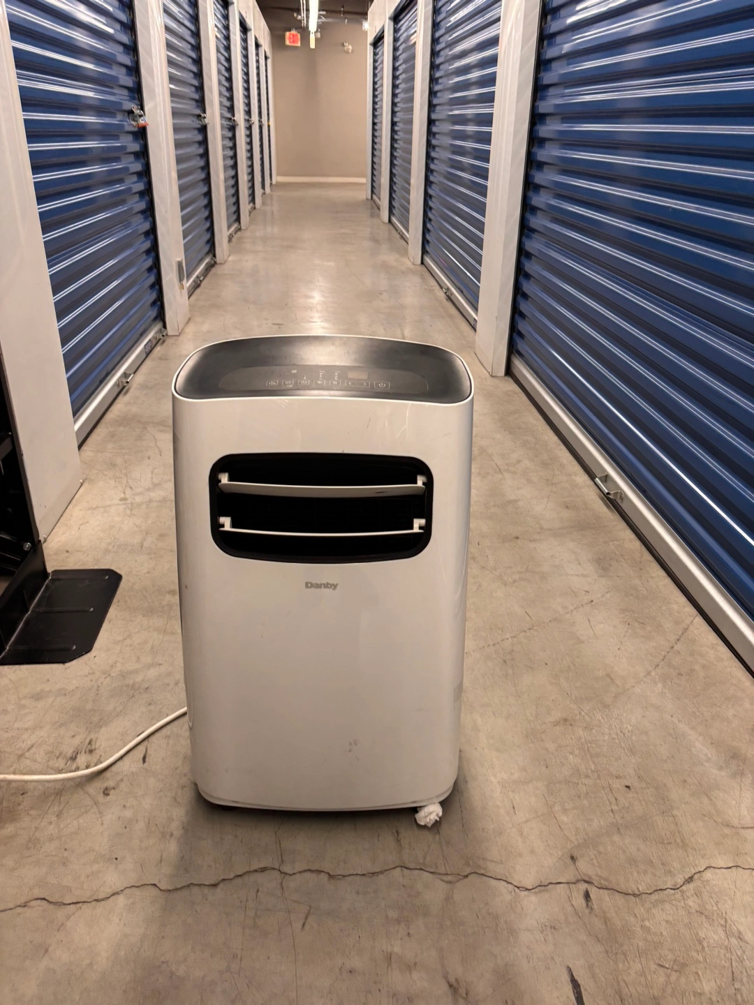 Danby white portable air conditioner. Features a digital display and control panel. Includes window attachment, tube and remote (all original accessories).