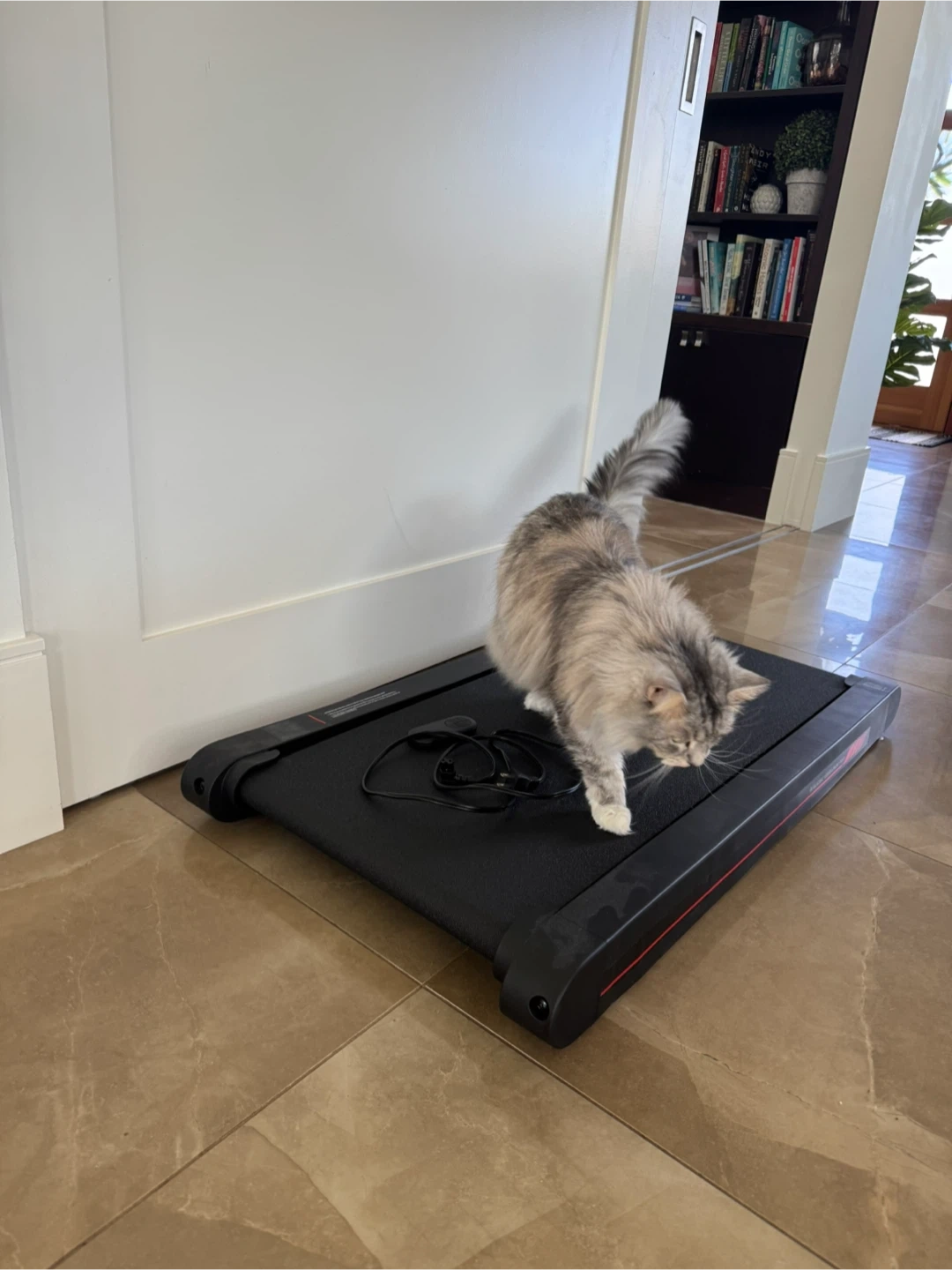 This compact treadmill is perfect for walking at home. It comes with a remote control for easy operation. Ideal for small spaces! Less than a year old…cat is just for views!
