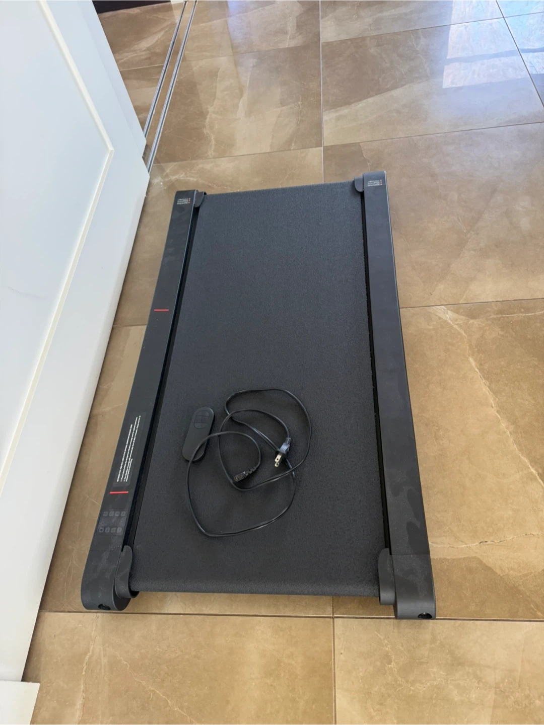 This compact treadmill is perfect for walking at home. It comes with a remote control for easy operation. Ideal for small spaces! Less than a year old…cat is just for views!