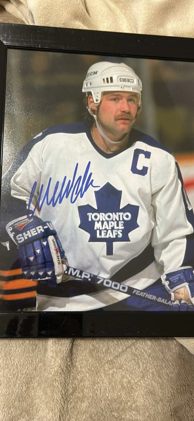 This is a Wendel Clark autographed photo of him in his Toronto Maple Leafs uniform. It's a great piece for any hockey fan or sports memorabilia collector, showcasing a Leafs legend in action. This item is in great condition making it a fantastic addition to any collection. Similar autographed hockey photos typically range from $50 to $200. I've priced this item competitively. Don't miss out on owning a piece of hockey history! If you're reading this, it's still available, so don't hesitate to reach out!