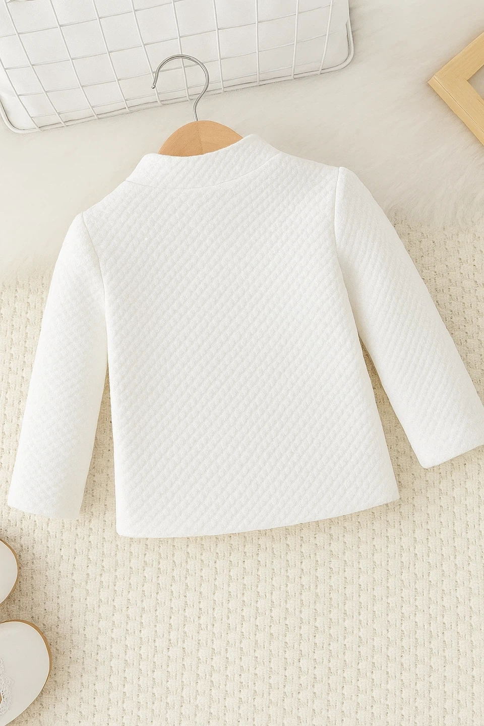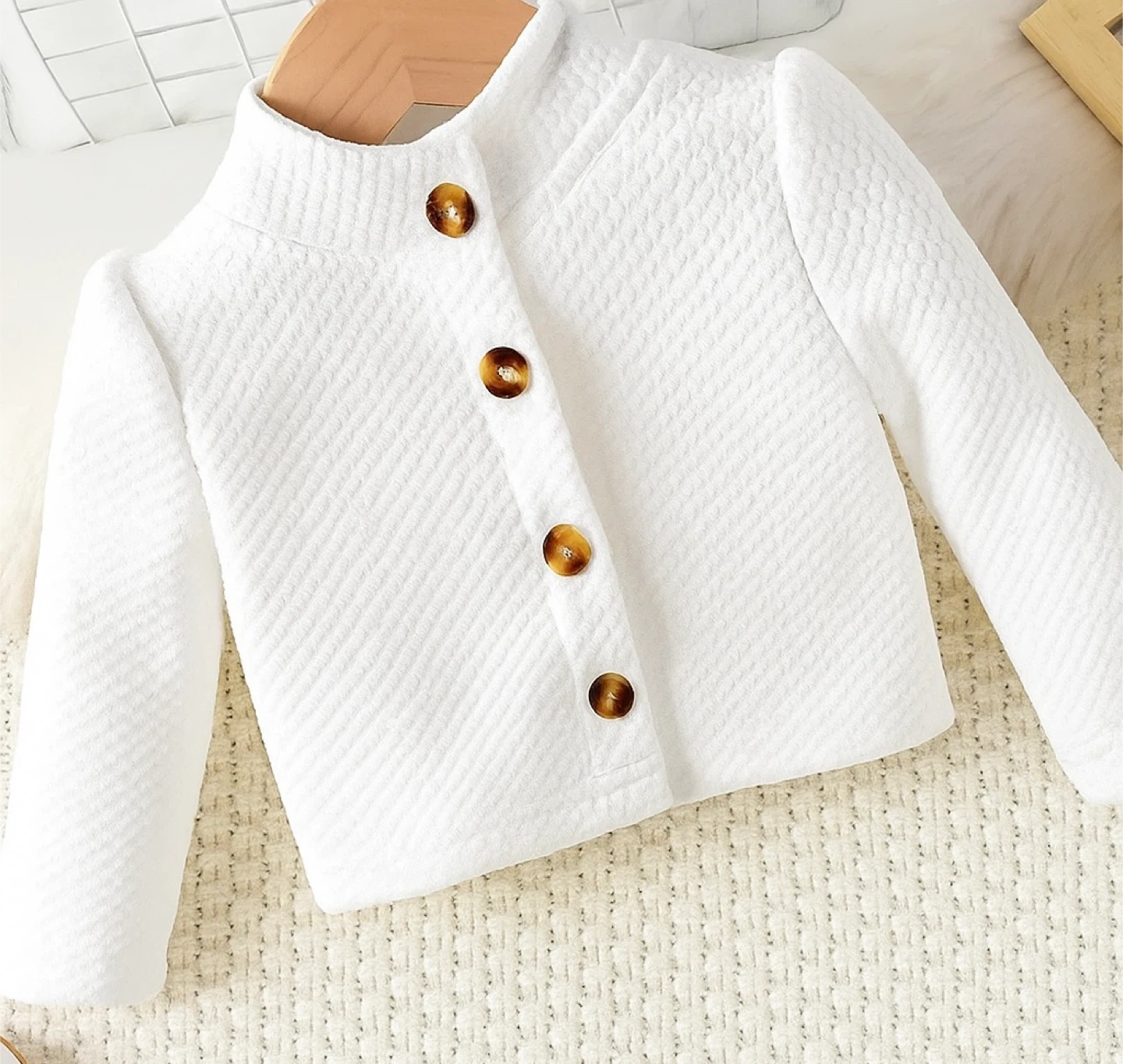 A cute white baby jacket with brown buttons. Perfect for keeping your little one warm and stylish!