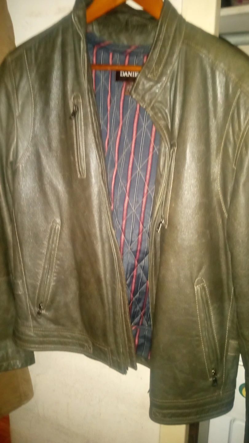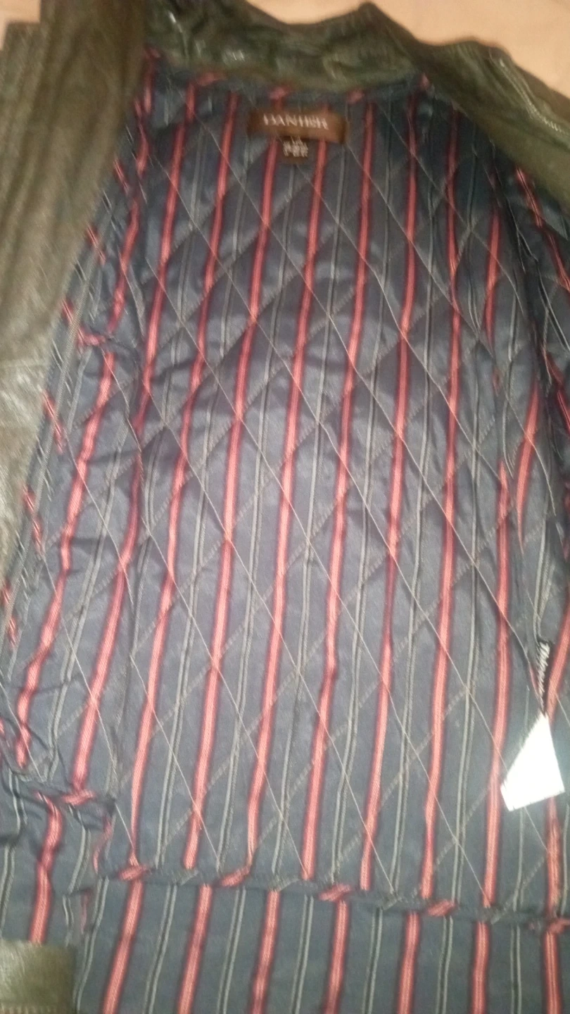 Men's Danier leather jacket in size L/G. It has a quilted lining with red and blue stripes. Features a zippered front and pockets.