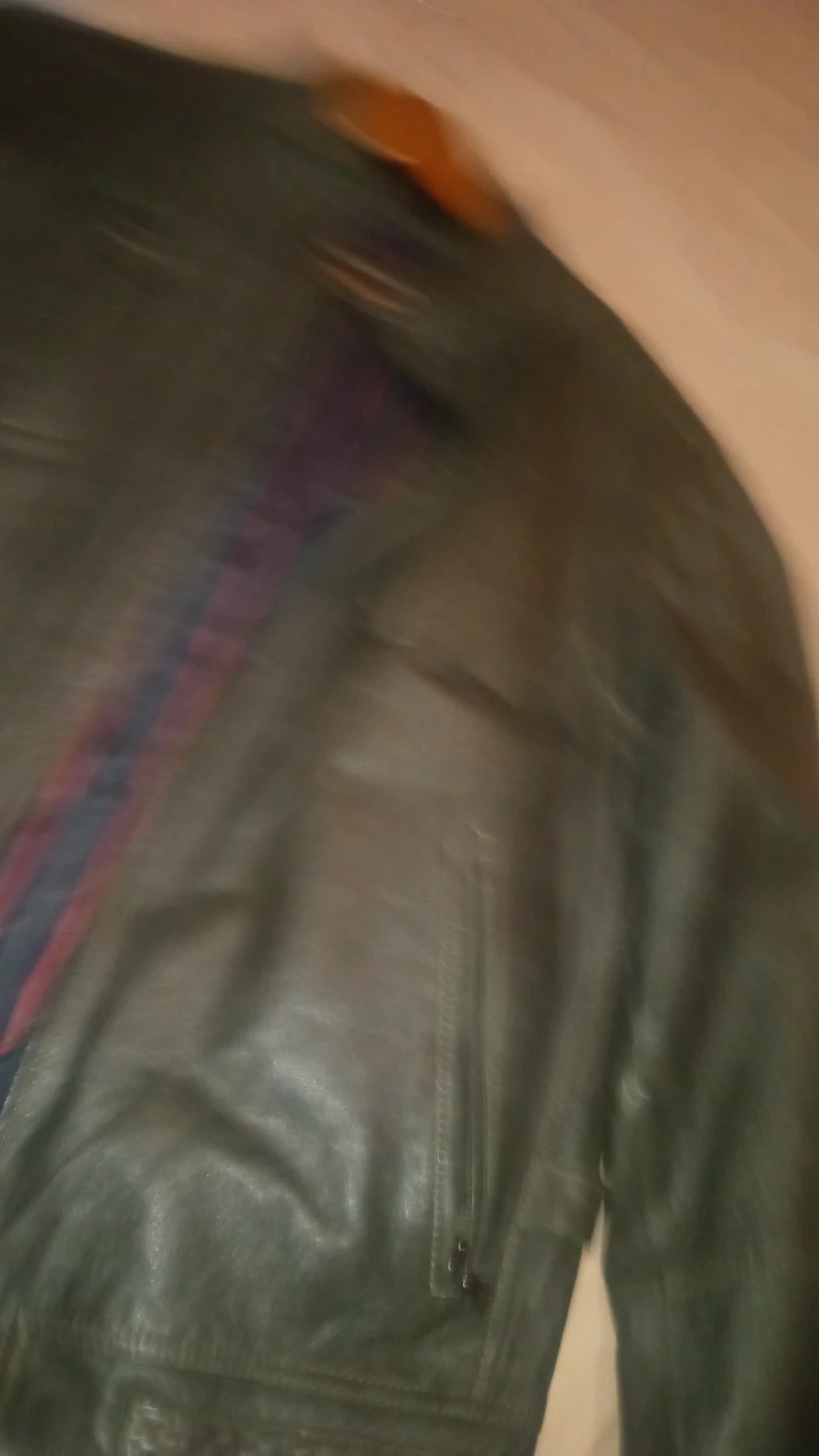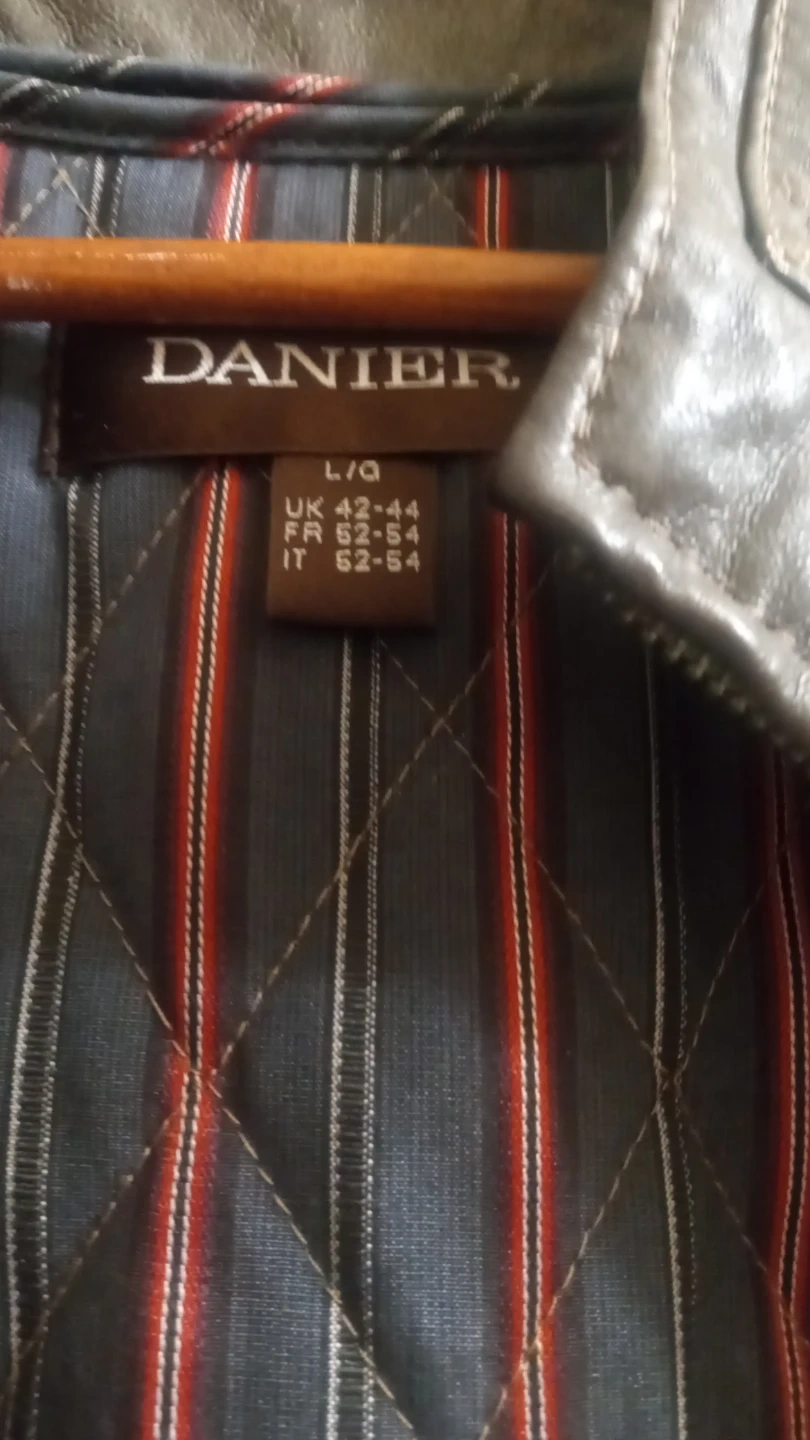 Men's Danier leather jacket in size L/G. It has a quilted lining with red and blue stripes. Features a zippered front and pockets.