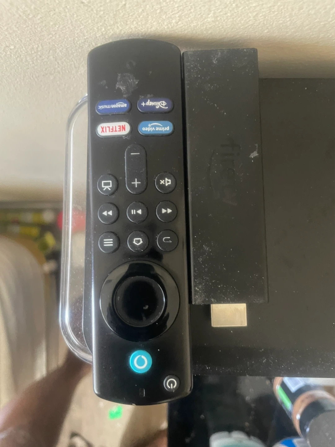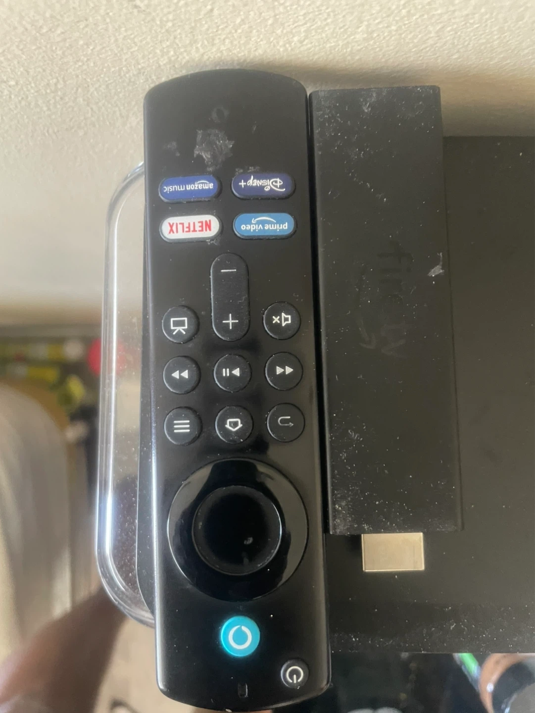 Black Amazon Fire TV Stick remote with dedicated buttons for Netflix, Prime Video, Disney+, and Amazon Music. Includes power and navigation controls.