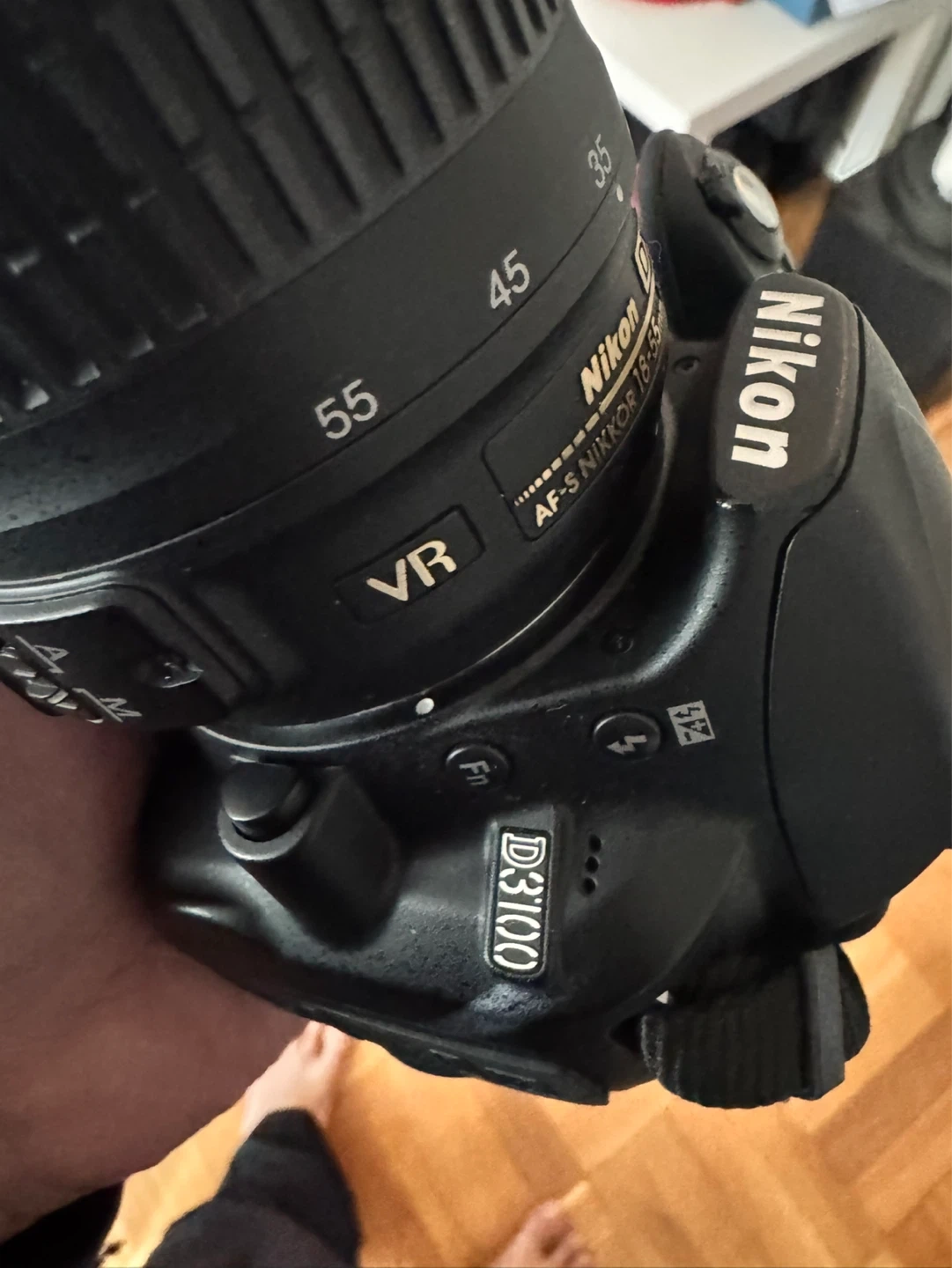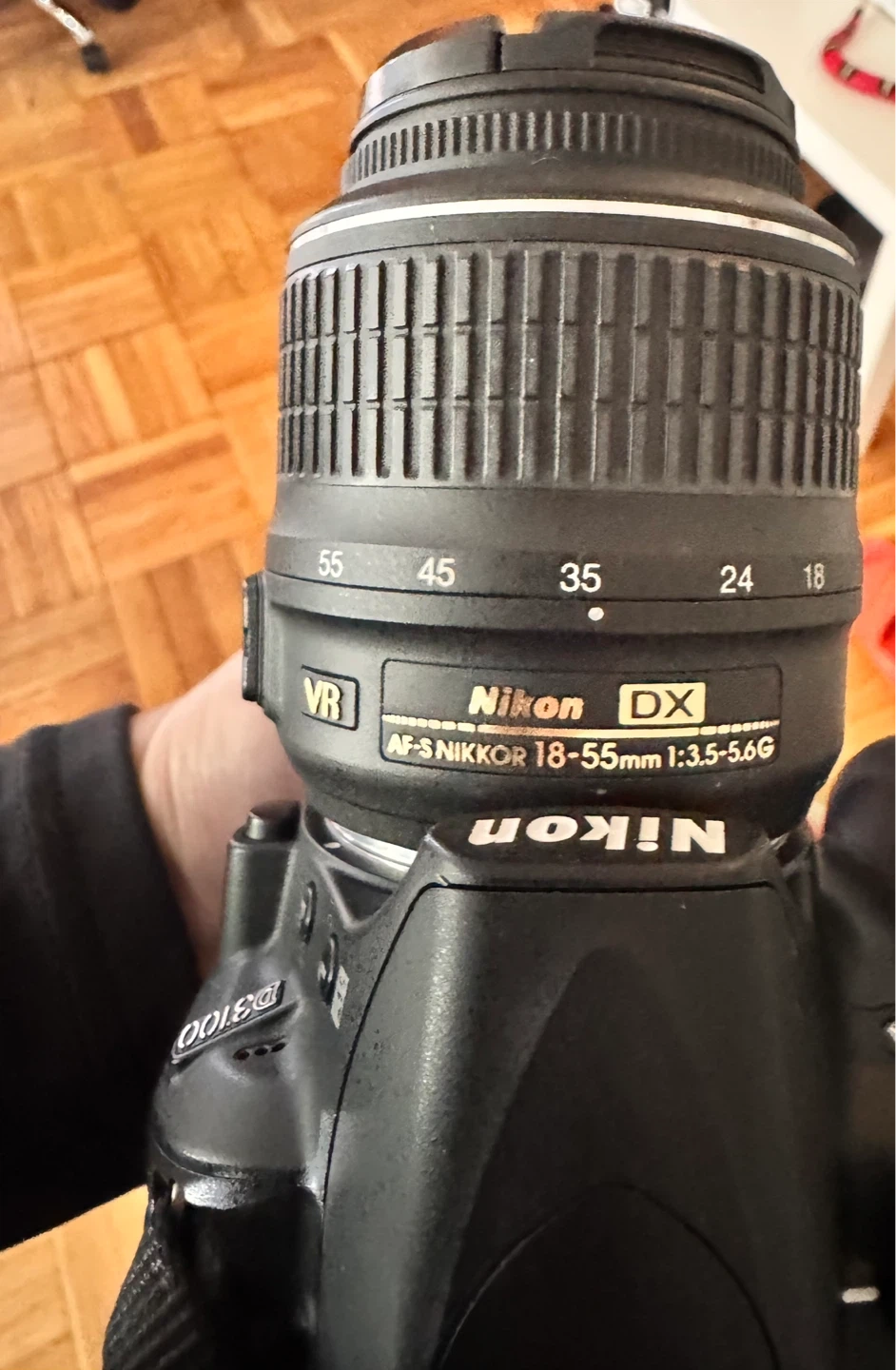 Nikon D3100 digital SLR camera with an AF-S NIKKOR 18-55mm 1:3.5-5.6G lens. Includes a Nikon camera bag. VR image stabilization for clear shots.